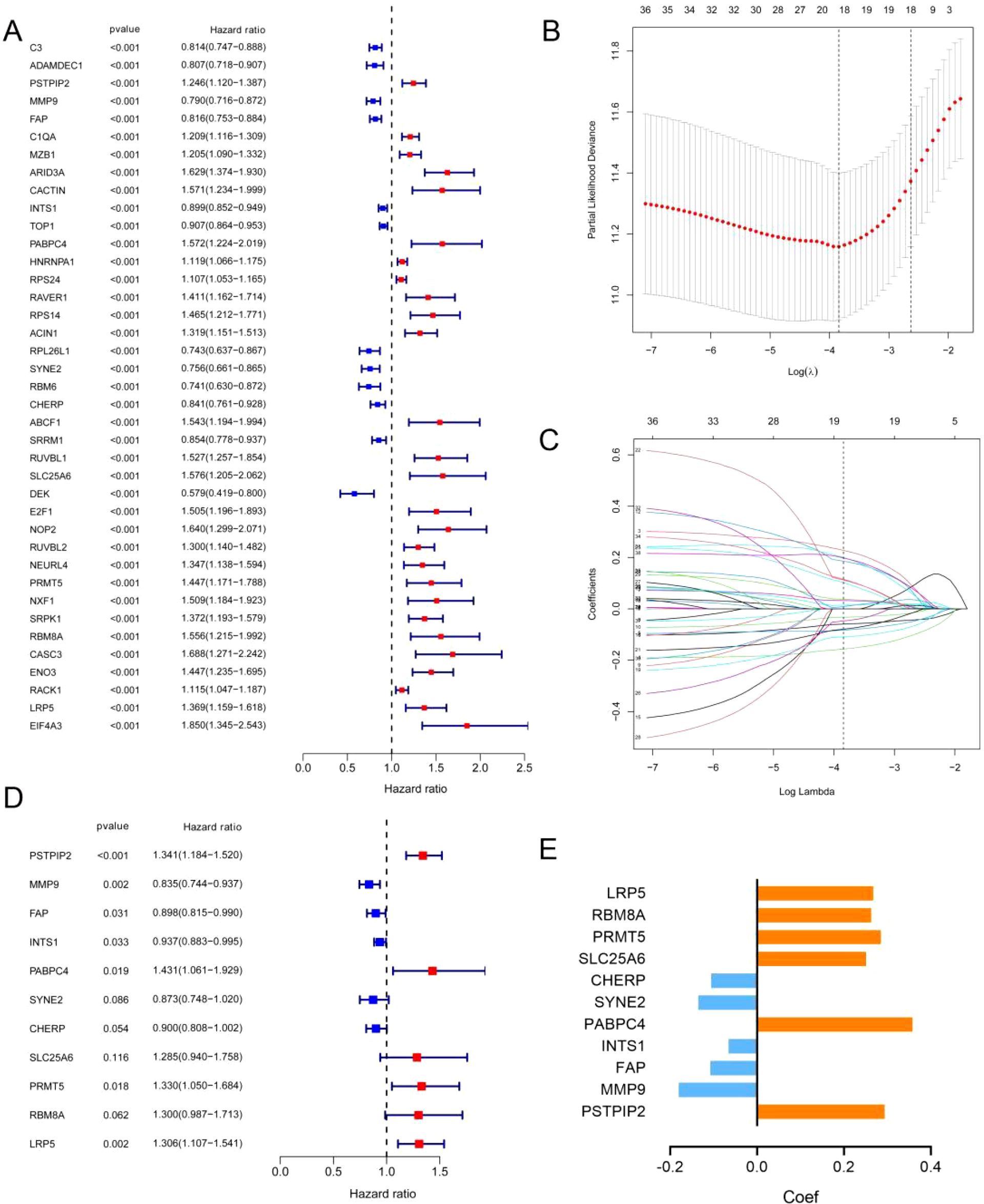 Figure 2. Identification of prognostic ERGs in the GSE10846 dataset. (A) P values and hazard ratios of 39 ERGs related to DLBCL prognosis according to univariate Cox regression analysis. (B) Selection of the optimal parameter (lambda) in the LASSO model. (C) LASSO coefficient profiles of 39 ERGs from univariate Cox regression analysis. (D) P values and hazard ratios of the 11 retained candidate genes according to multivariate Cox regression analysis. (E) Multivariate Cox coefficient of the 11 candidate genes for ERG scoring model construction.