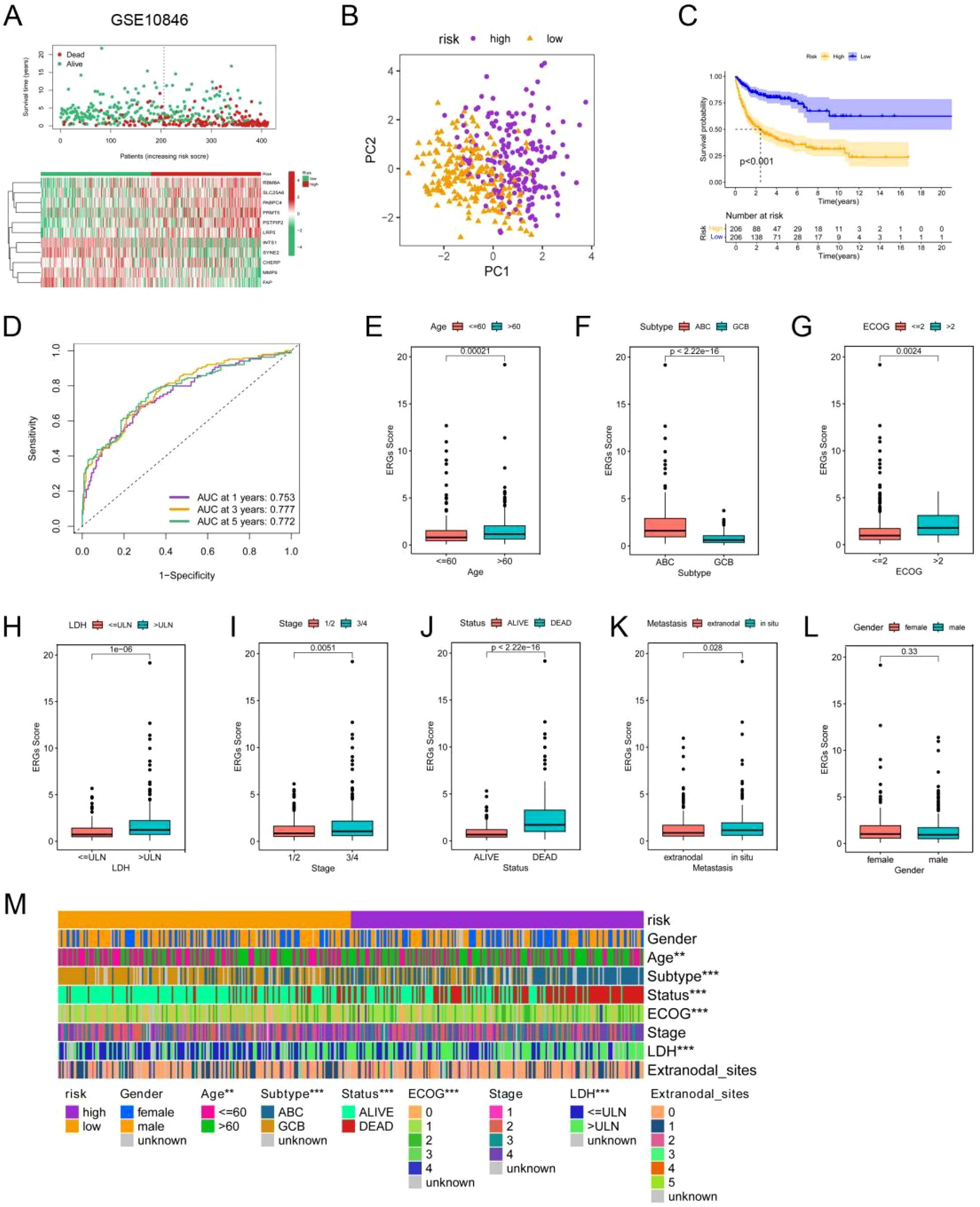Figure 3. Construction and validation of the ERG scoring model and correlations between the ERG score and clinical features in the GSE10864 dataset. (A) Distribution of the survival status and ERG expression in DLBCL patients in the GSE10864 cohorts. (B) PCA of the DLBCL patients in the GSE10864 cohorts on the basis of the ERG score. (C) KM analyses of the ERG scores in theGSE10864 cohorts. (D) Time-dependent ROC curves of the ERG scores in the GSE10864 cohorts. Correlations of the ERG score with age (E), subtype (F), ECOG score (G), LDH level (H), clinical stage (I), patient status (J), extranodal infiltration (K), and gender (L). (M) Heatmap showing the differences in clinical characteristics between the two risk clusters. *p< 0.05; **p< 0.01; ***p< 0.001.