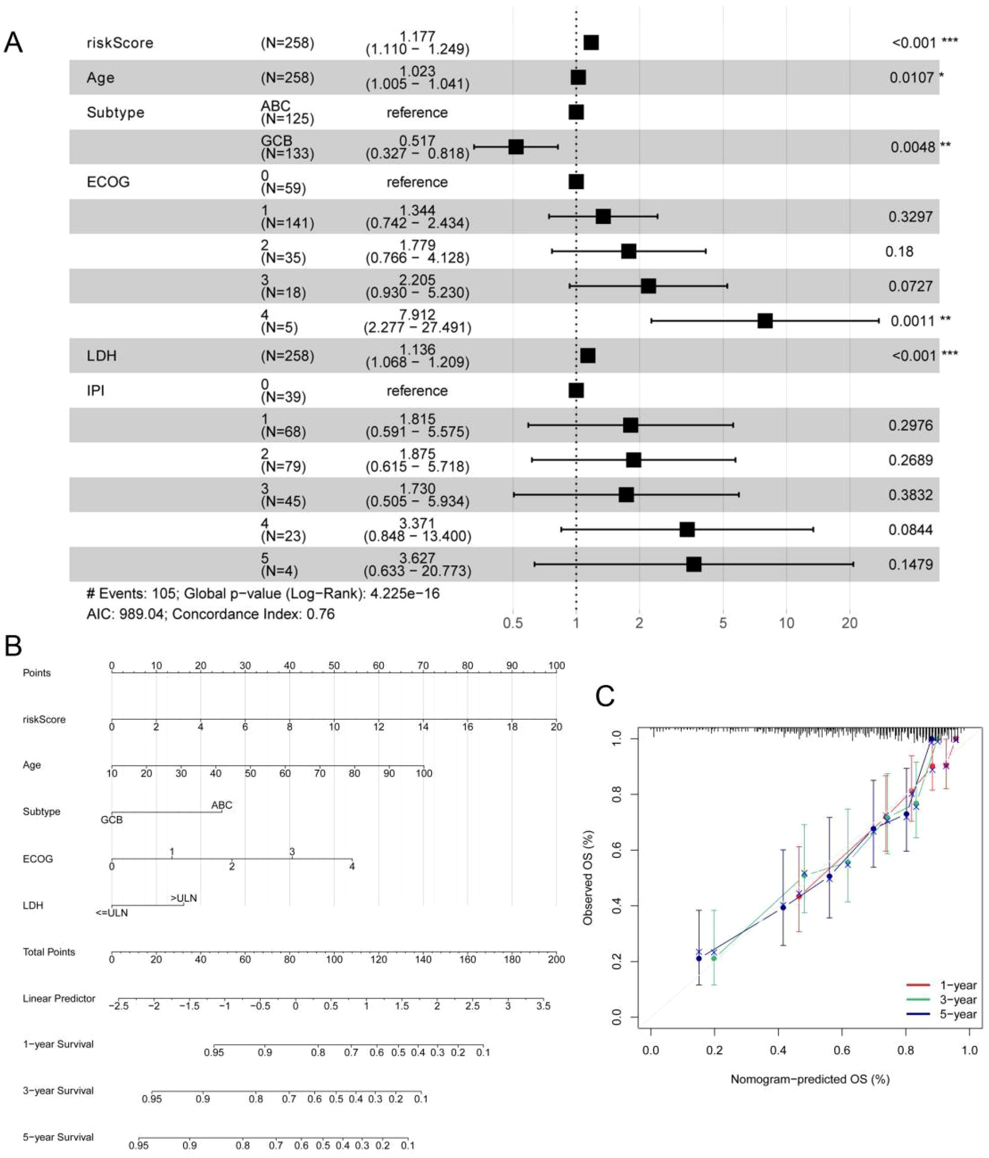 Figure 4. Multivariate Cox regression analysis and the nomogram based on the ERG score, IPI and clinical features in the GSE10846 cohort. (A) Multivariate Cox regression analysis of ERG score, IPI and clinical features in GSE10846 training cohort. (B) A nomogram for the prediction of the 1-, 3- and 5-year survival probabilities of DLBCL patients according to the ERG score, IPI and clinical factors. (C) Nomogram-predicted percentages and the observed probabilities of 1-, 3- and 5-year survival. *p< 0.05; **p< 0.01; ***p< 0.001.