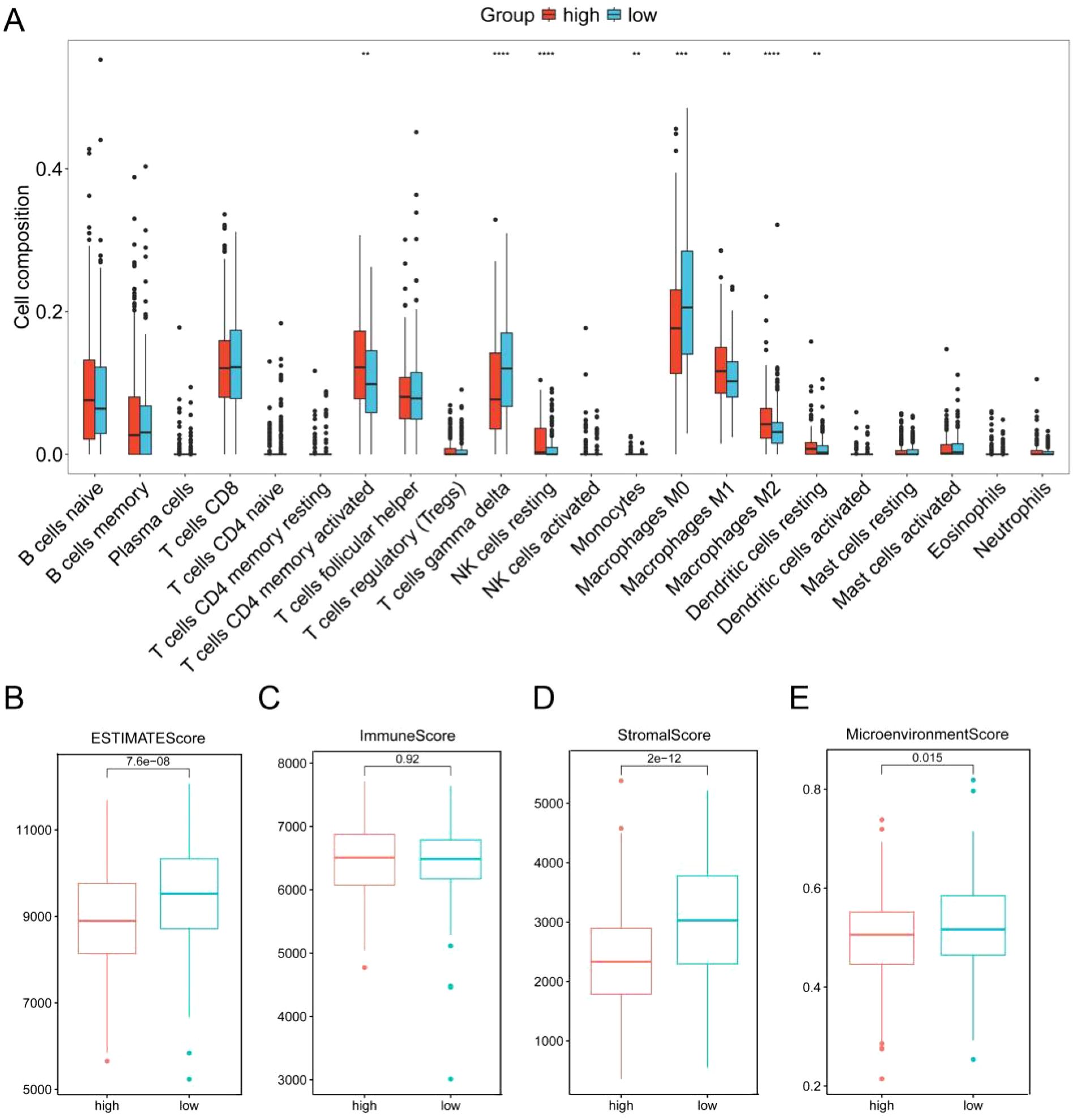 Figure 5. Correlation analysis of the ERG score with the immune landscape in GSE10846. (A) Proportion of 22 immune cells between the low-risk and high-risk groups according to CIBERSORT. ESTIMATE score (B), stromal score (C), immune score (D) and microenvironment score (E) between the high-score and low-score groups. **p< 0.01; ***p< 0.001; ****p< 0.0001.