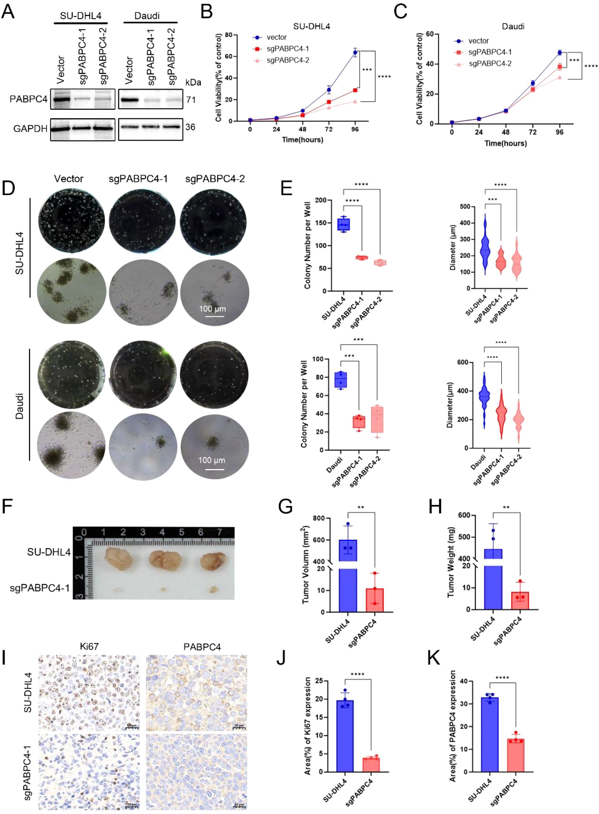 Figure 7. Knockdown of PABPC4 inhibits B lymphoma cell proliferation and colony formation in vitro and in vivo. (A) PABPC4 expression in stable sgPABPC4 SU-DHL4 and Daudi cell lines. (B, C) Cell viability of control and sgPABPC4 cells at different time points. (D) Effects of PABPC4 knockdown on cell colony formation. Representative images of colony formation by different cells are shown. (E) Statistical analysis of the colony numbers and colony diameters in (D). Representative images (F), tumor volumes (G), and tumor weights (H) of xenografts derived from the indicated cells are shown. (I) Immunohistochemical results of PABPC4 and Ki67 expression in tumors from different xenograft groups. (J, K) Statistical analysis of the results in (I). **p< 0.01; ***p< 0.001; ****p< 0.0001.