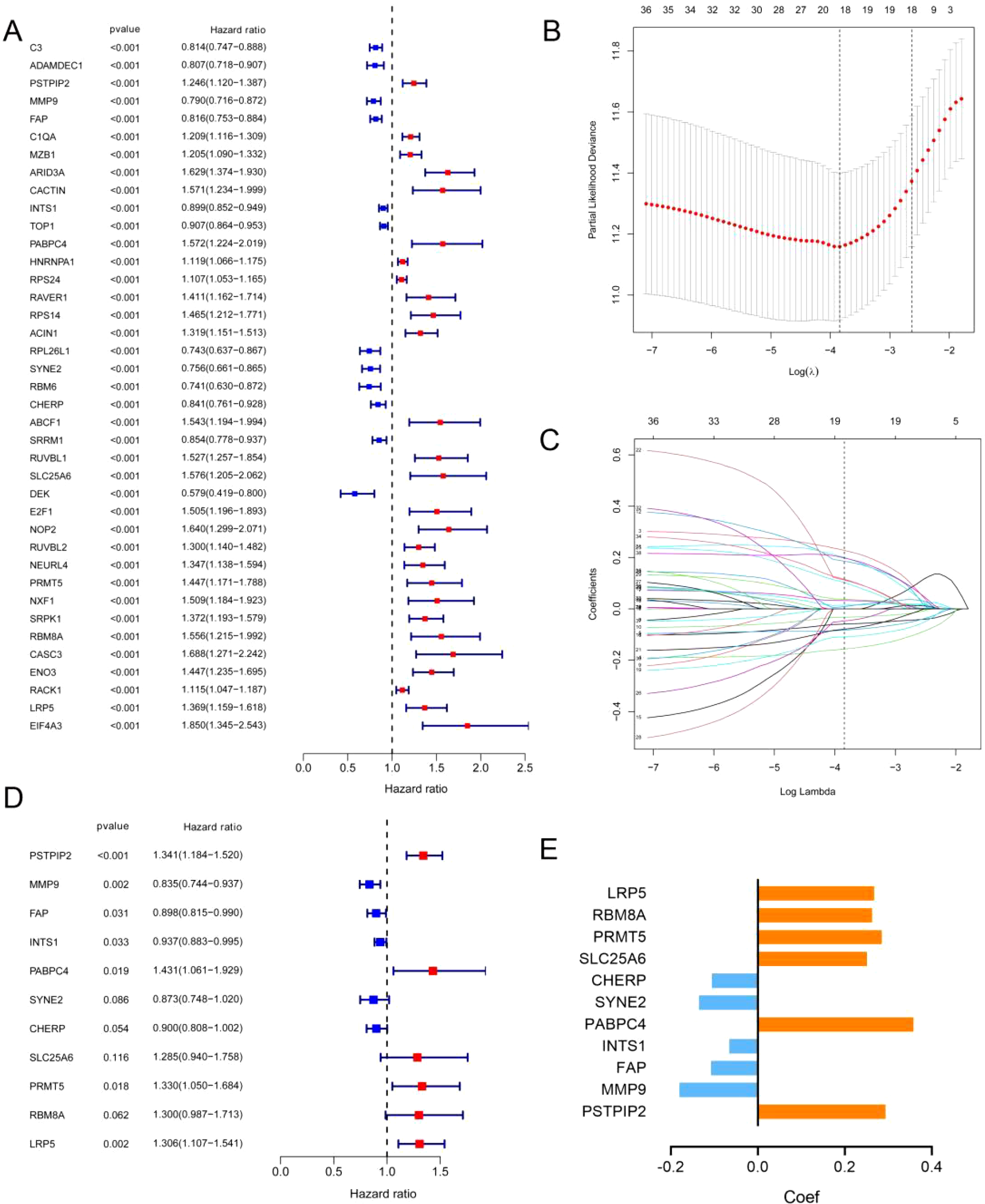 Identification of prognostic ERGs in the GSE10846 dataset. (A) P values and hazard ratios of 39 ERGs related to DLBCL prognosis according to univariate Cox regression analysis. (B) Selection of the optimal parameter (lambda) in the LASSO model. (C) LASSO coefficient profiles of 39 ERGs from univariate Cox regression analysis. (D) P values and hazard ratios of the 11 retained candidate genes according to multivariate Cox regression analysis. (E) Multivariate Cox coefficient of the 11 candidate genes for ERG scoring model construction.