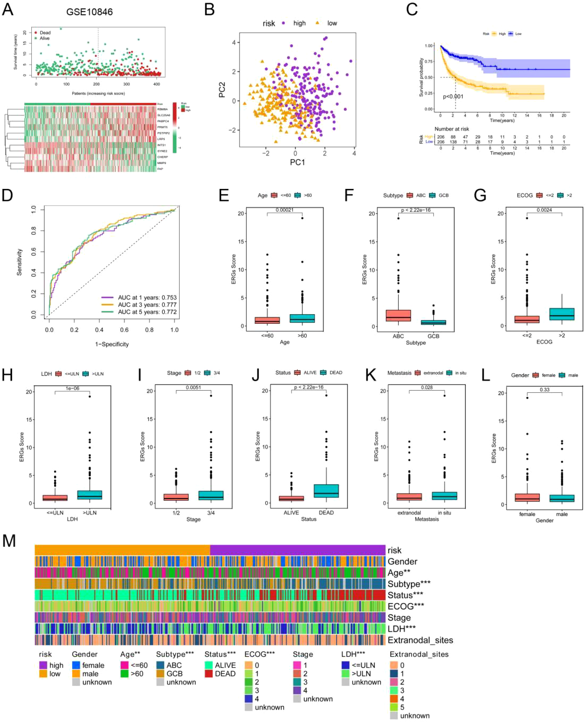 Construction and validation of the ERG scoring model and correlations between the ERG score and clinical features in the GSE10864 dataset. (A) Distribution of the survival status and ERG expression in DLBCL patients in the GSE10864 cohorts. (B) PCA of the DLBCL patients in the GSE10864 cohorts on the basis of the ERG score. (C) KM analyses of the ERG scores in theGSE10864 cohorts. (D) Time-dependent ROC curves of the ERG scores in the GSE10864 cohorts. Correlations of the ERG score with age (E), subtype (F), ECOG score (G), LDH level (H), clinical stage (I), patient status (J), extranodal infiltration (K), and gender (L). (M) Heatmap showing the differences in clinical characteristics between the two risk clusters. *p< 0.05; **p< 0.01; ***p< 0.001.