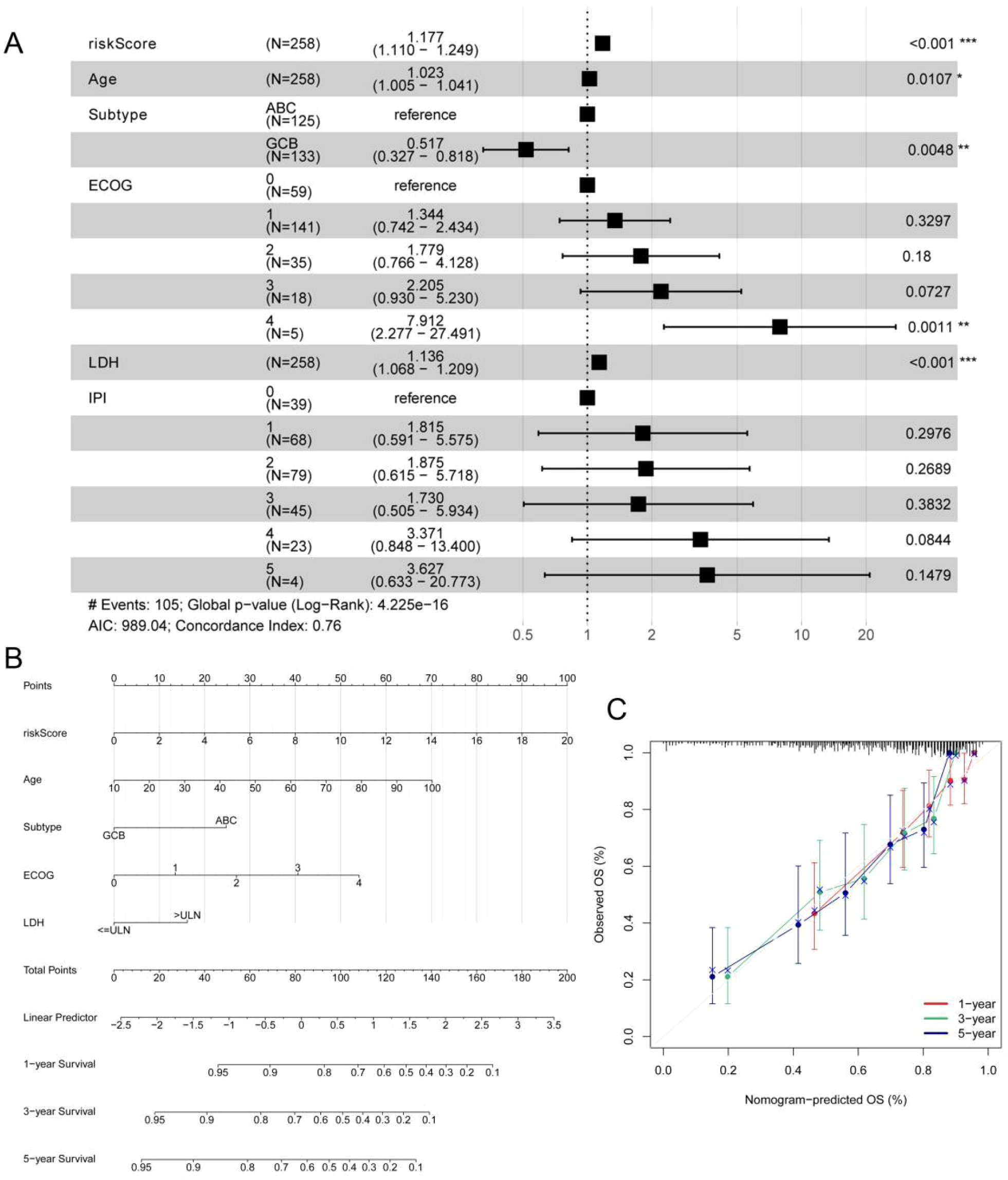 Multivariate Cox regression analysis and the nomogram based on the ERG score, IPI and clinical features in the GSE10846 cohort. (A) Multivariate Cox regression analysis of ERG score, IPI and clinical features in GSE10846 training cohort. (B) A nomogram for the prediction of the 1-, 3- and 5-year survival probabilities of DLBCL patients according to the ERG score, IPI and clinical factors. (C) Nomogram-predicted percentages and the observed probabilities of 1-, 3- and 5-year survival. *p< 0.05; **p< 0.01; ***p< 0.001.