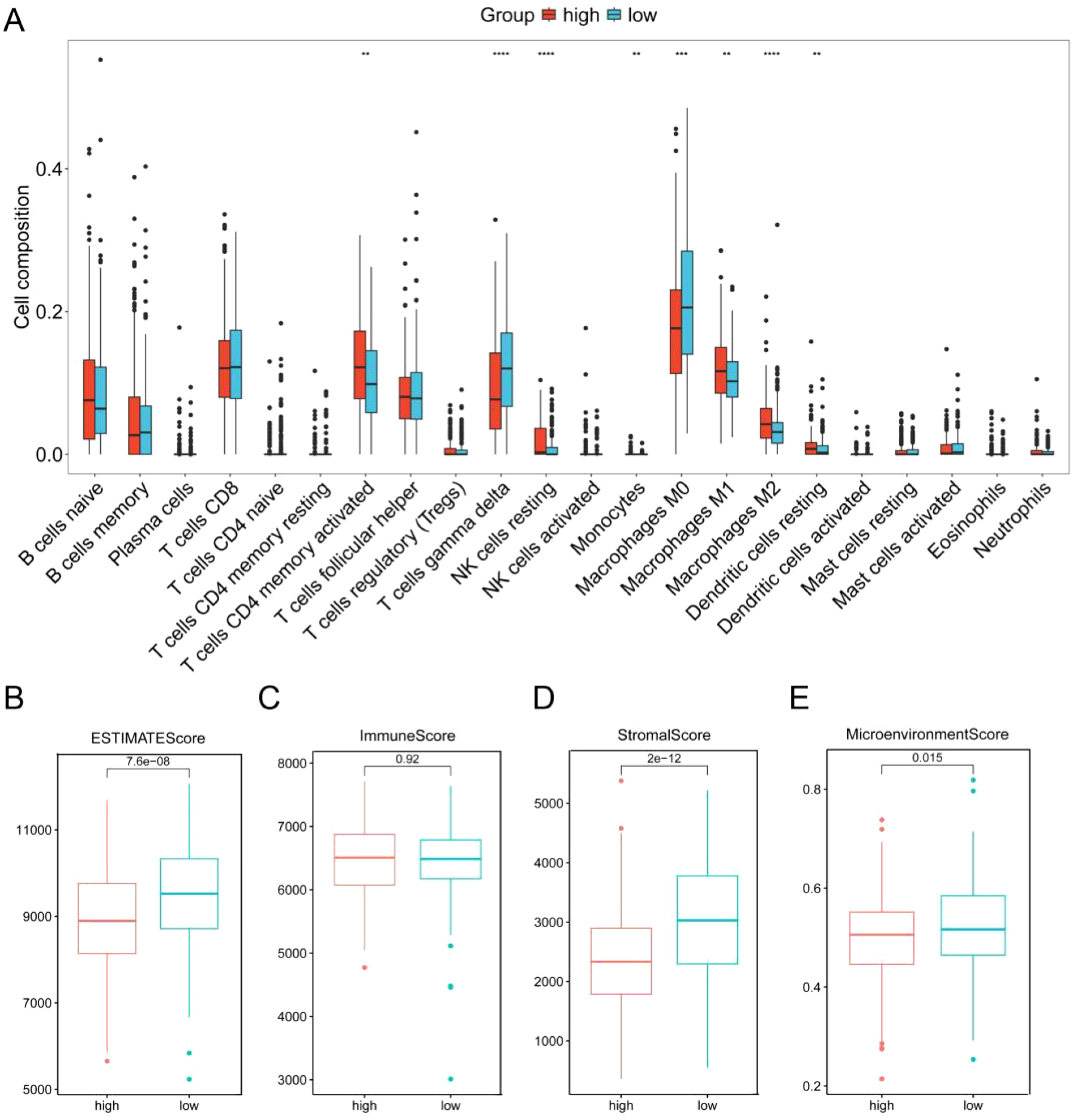 Correlation analysis of the ERG score with the immune landscape in GSE10846. (A) Proportion of 22 immune cells between the low-risk and high-risk groups according to CIBERSORT. ESTIMATE score (B), stromal score (C), immune score (D) and microenvironment score (E) between the high-score and low-score groups. **p< 0.01; ***p< 0.001; ****p< 0.0001.