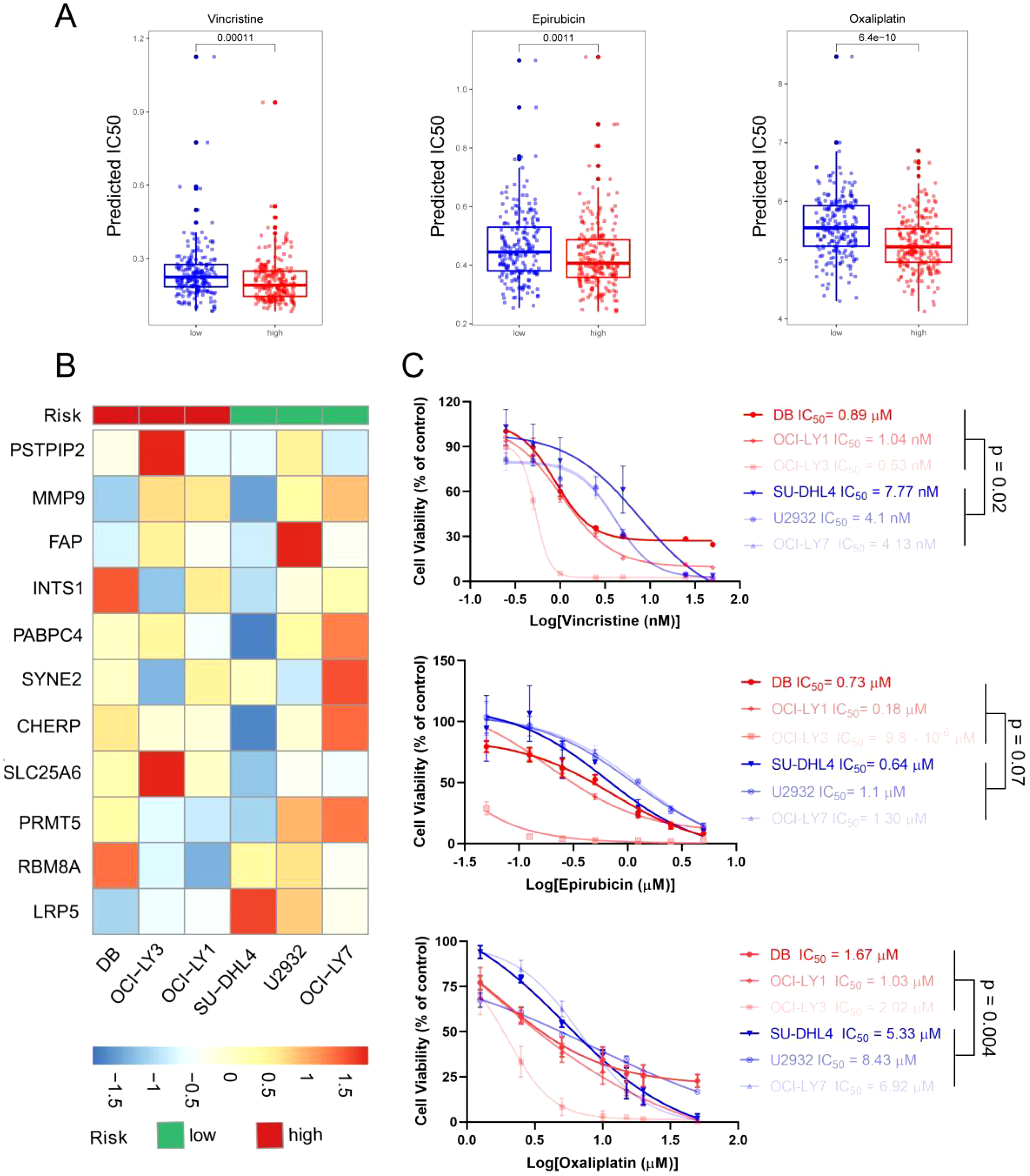 Evaluation of therapeutic response and drug sensitivity via the ERG scoring model. (A) The predicted IC50 values of vincristine, epirubicin, and oxaliplatin between the high- and low-risk groups via the R package “oncoPredict”. (B) Six DLBCL cell lines were separated into high- and low-risk groups on the basis of the ERG scoring model. (C) The actual IC50 values of vincristine, epirubicin, and oxaliplatin in the 6 DLBCL cell lines.