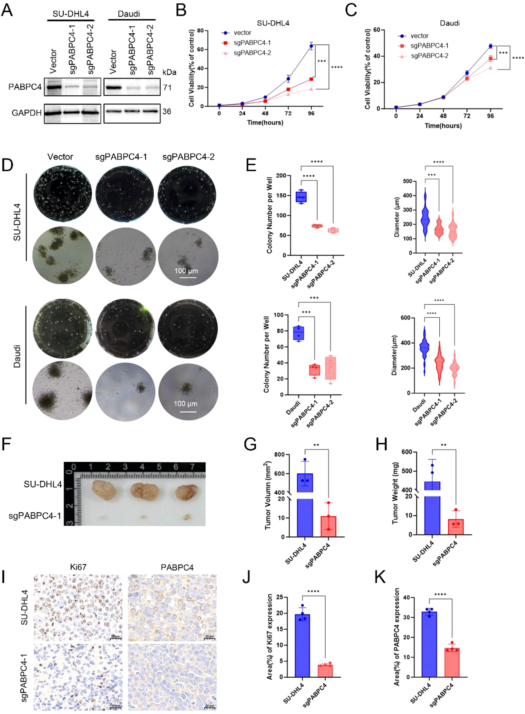 Knockdown of PABPC4 inhibits B lymphoma cell proliferation and colony formation in vitro and in vivo. (A) PABPC4 expression in stable sgPABPC4 SU-DHL4 and Daudi cell lines. (B, C) Cell viability of control and sgPABPC4 cells at different time points. (D) Effects of PABPC4 knockdown on cell colony formation. Representative images of colony formation by different cells are shown. (E) Statistical analysis of the colony numbers and colony diameters in (D). Representative images (F), tumor volumes (G), and tumor weights (H) of xenografts derived from the indicated cells are shown. (I) Immunohistochemical results of PABPC4 and Ki67 expression in tumors from different xenograft groups. (J, K) Statistical analysis of the results in (I). **p< 0.01; ***p< 0.001; ****p< 0.0001.