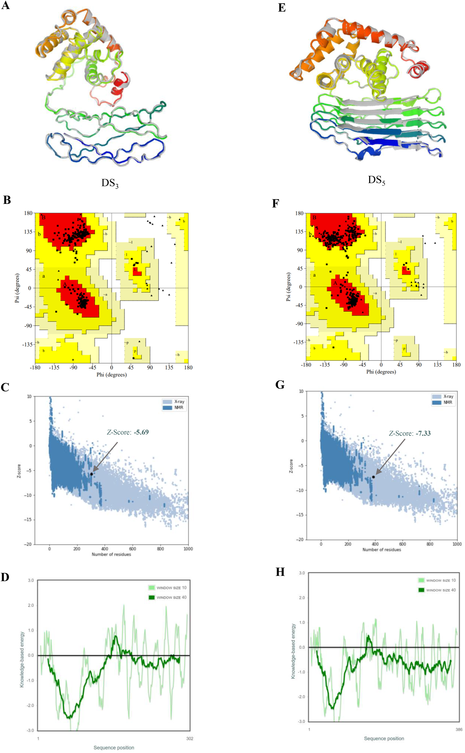 Refinement and validation of tertiary structures for DS3 and DS5 vaccines. Tertiary structures of DS3(A) and DS5(E) were refined using GalaxyRefine web server, with initial structures depicted in gray and refined structures shown in rainbow colors. Ramachandran plots for refined structures, generated via PROCHECK, indicate that 94.3% of DS3 residues (B) are located in the most favored regions, 5.7% in additional allowed regions, 0.0% in generously allowed regions, and 0.0% in disallowed regions. For DS5(F), 93.7% of residues are in the most favored regions, 6.3% in additional allowed regions, and 0.0% in both generously allowed and disallowed. Z-scores obtained from ProSA-web for DS3(C) and DS5(G) models are -5.69 and -7.33, respectively (black dots), both within the conformational score range for experimentally validated protein structures. Panels (D) and (H) display energy plots of the amino acid compositions for DS3 and DS5, respectively.