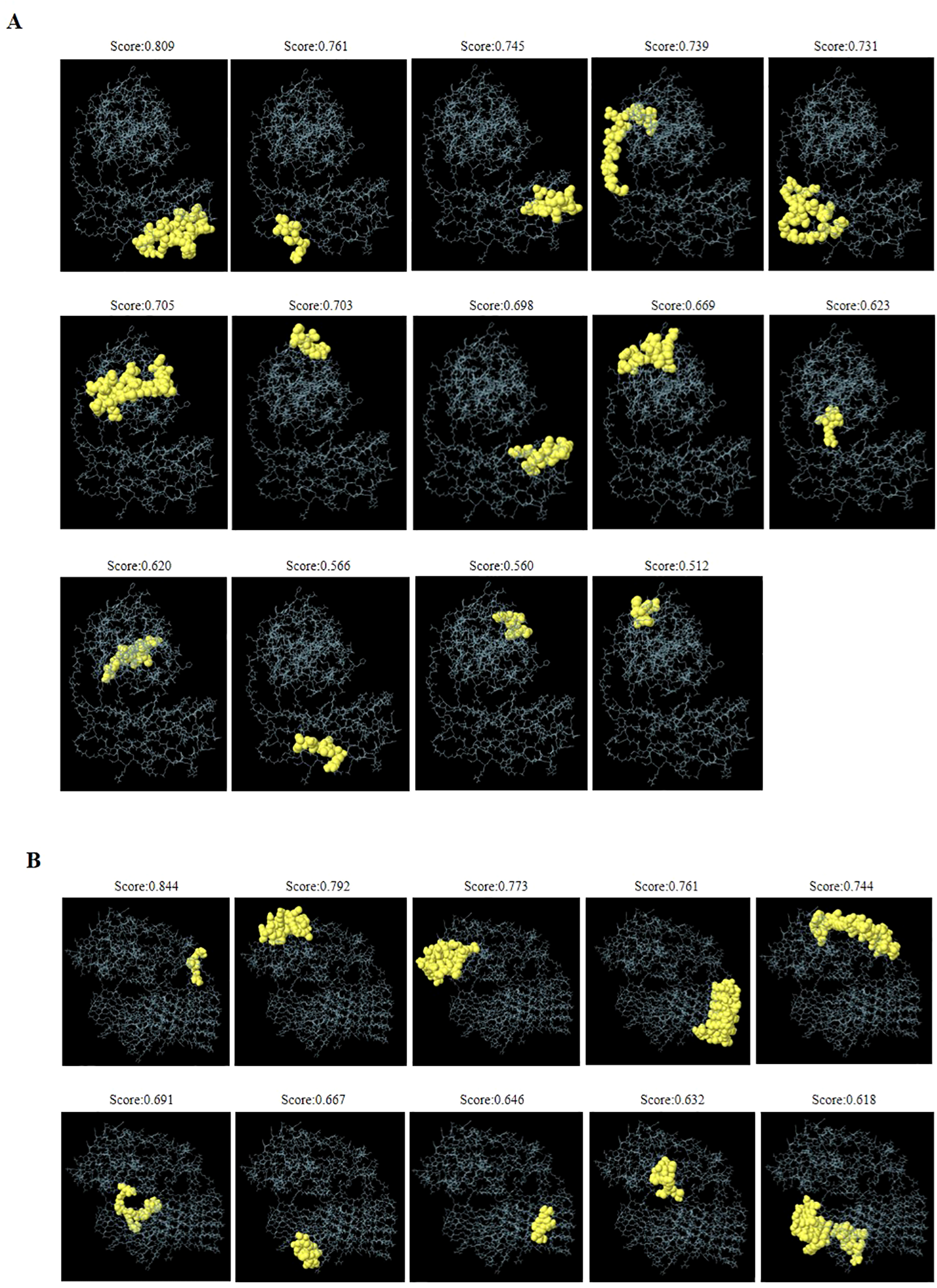 Three-dimensional representation of discontinuous B-cell epitopes predicted for the refined DS3 and DS5 vaccines. (A) Fourteen discontinuous B-cell epitopes of the refined DS3 vaccine are displayed, while (B) ten discontinuous B-cell epitopes of the refined DS5 vaccine are shown. The discontinuous B-cell epitopes are represented as yellow spheres, with the remaining vaccine residues illustrated as gray sticks.