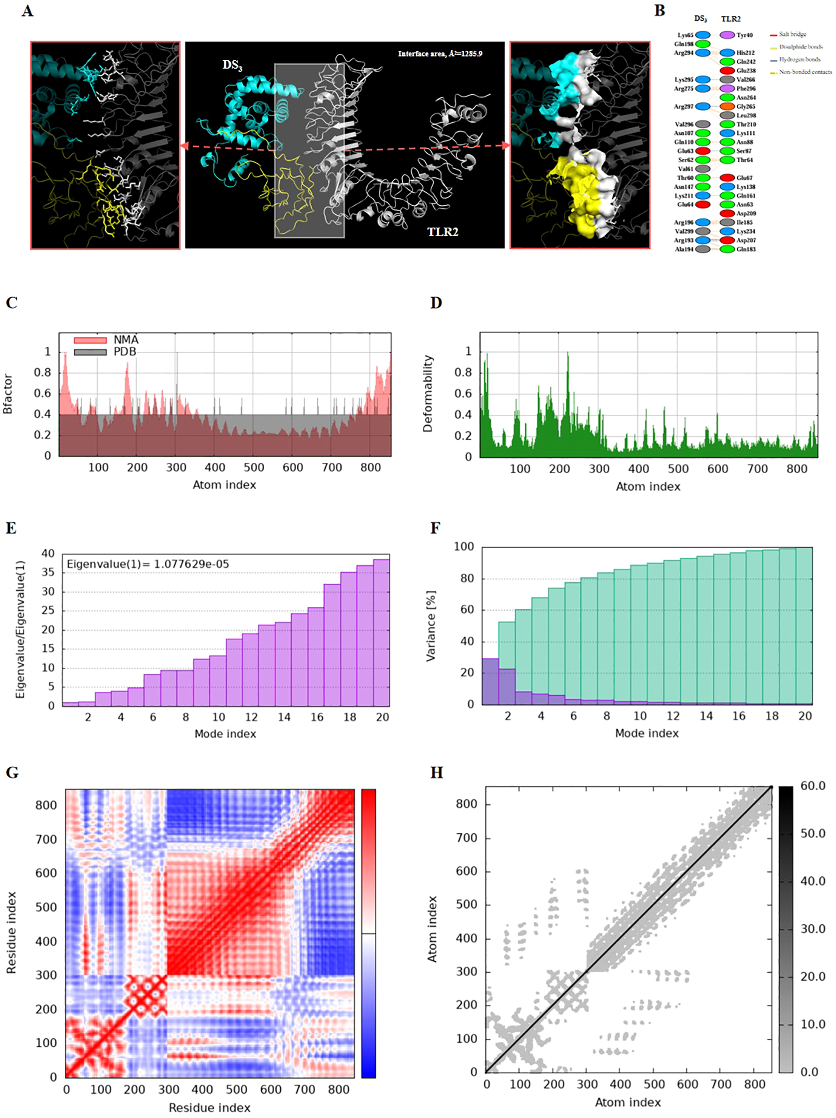 Molecular dynamics simulations of the vaccine-TLR2 docking complex were performed utilizing the internal coordinate normal mode analysis server (iMODS) (35). This platform employs Normal Mode Analysis (NMA) in internal coordinates to identify collective motions that are critical for the functional dynamics of macromolecules. iMODS provides interactive tools for visualizing these modes, including vibration analysis, motion animations, and morphing trajectories.