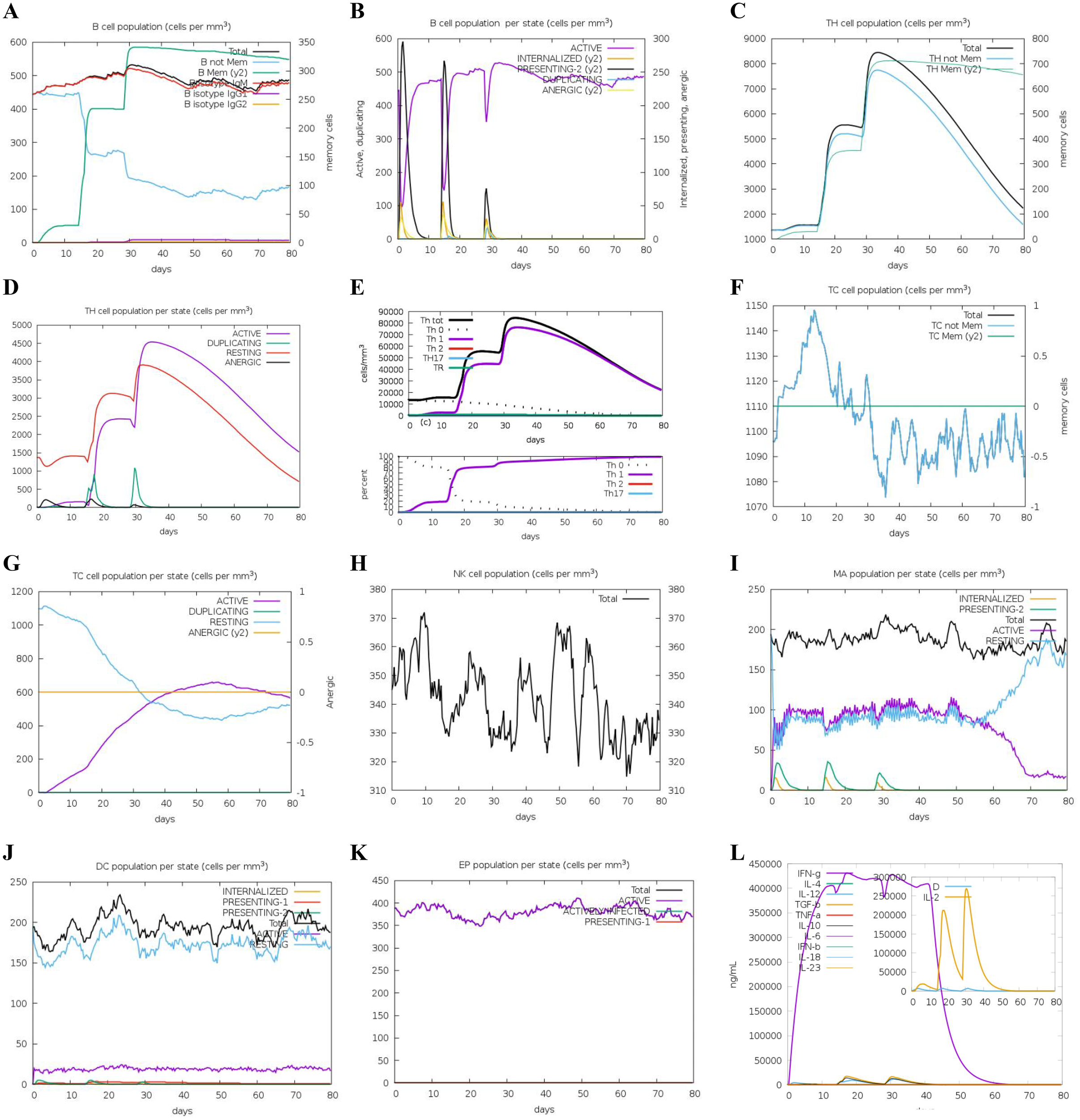 To evaluate the immunogenic potential of candidate vaccines, we employed the C-ImmSim server (20), a platform capable of simulating immune responses. This computational tool mimics the activation of B and T lymphocytes following hypothetical vaccine administration, allowing for the exploration of immune response dynamics. The simulation parameters were configured as follows: Random Seed = 12,345, Simulation Volume = 10, Simulation Steps = 240, and HLA selections: A0101, B0702, and DRB1_0101. The simulation framework was designed to include three administrations of 400 antigens, each spaced by a two-week interval. Each time step was delineated to represent an elapsed duration of 8 hours in real-world time, leading to time periods set at 1, 42, and 84. The simulation predicted the cellular immune responses provoked by candidate vaccines, encompassing antibody production, B cell and T cell activation, and cytokine release. The vaccine demonstrating the highest titer of IgG2 antibody were subsequently selected for further analysis, given that the IgG2 subtype is known to mediate the function against SOST in ROMO (21).