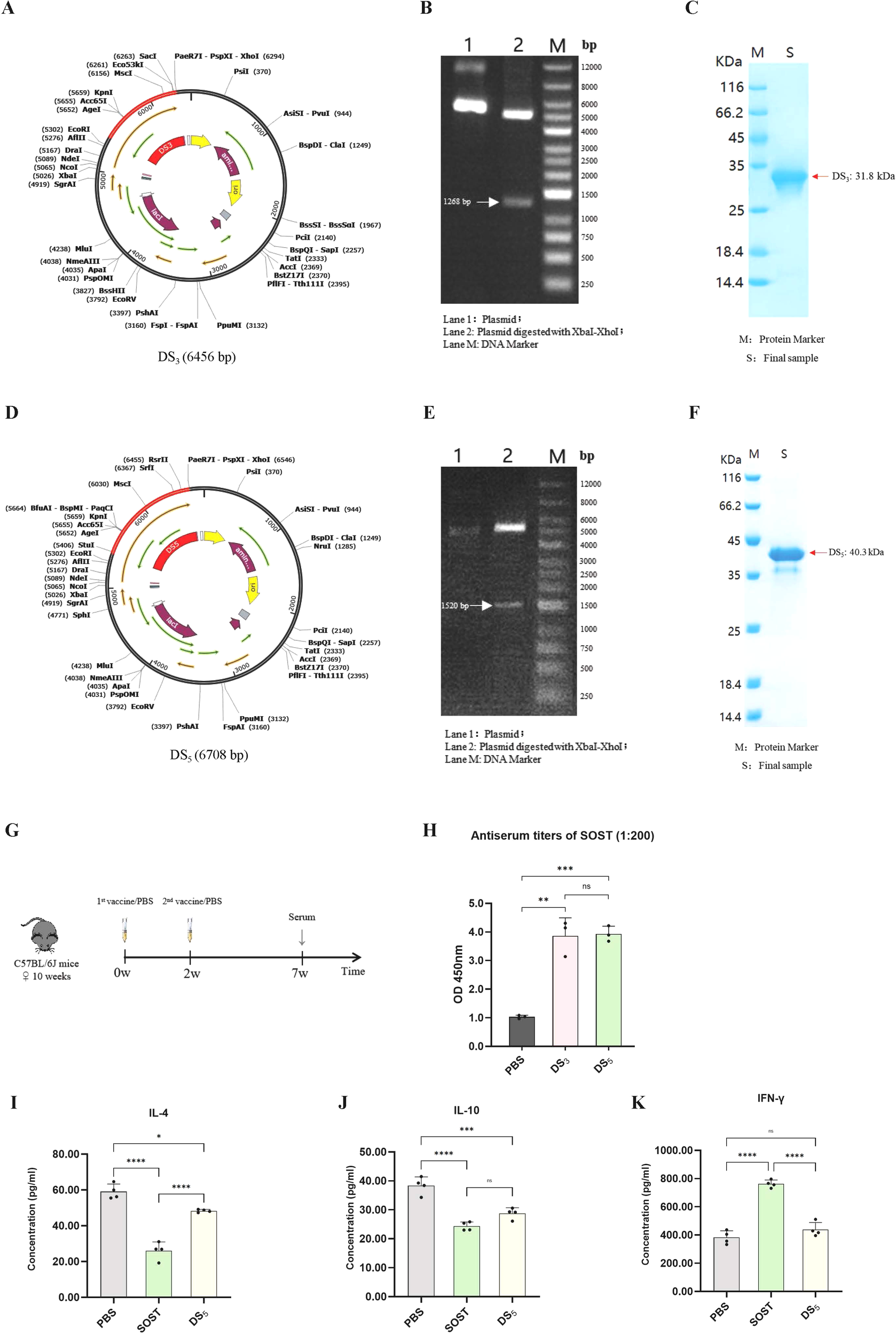 Immunogenicity assays demonstrated that both DDT-SOST(131-163)3 (DS3) and DDT-SOST(131-163)5 (DS5) elicited strong IgG2 antibody responses comparable to ROMO. Molecular docking studies indicated strong affinities of DS3 and DS5 for Toll-like receptor 2 (TLR2), enhancing TLR2-mediated humoral B-cell immunity and eliciting synergistic T-helper cell responses. Recombinant expression in Escherichia coli confirmed the successful production of DS3 and DS5, with molecular weights of 31.8 kDa and 40.3 kDa, respectively. In vivo experiments showed that the vaccines effectively induced high-titer anti-SOST antibodies in mice, overcoming immune tolerance. Additionally, cell-based assays indicated that antiserum from vaccinated mice inhibited osteoclast differentiation and promoted osteoblast mineralization.
