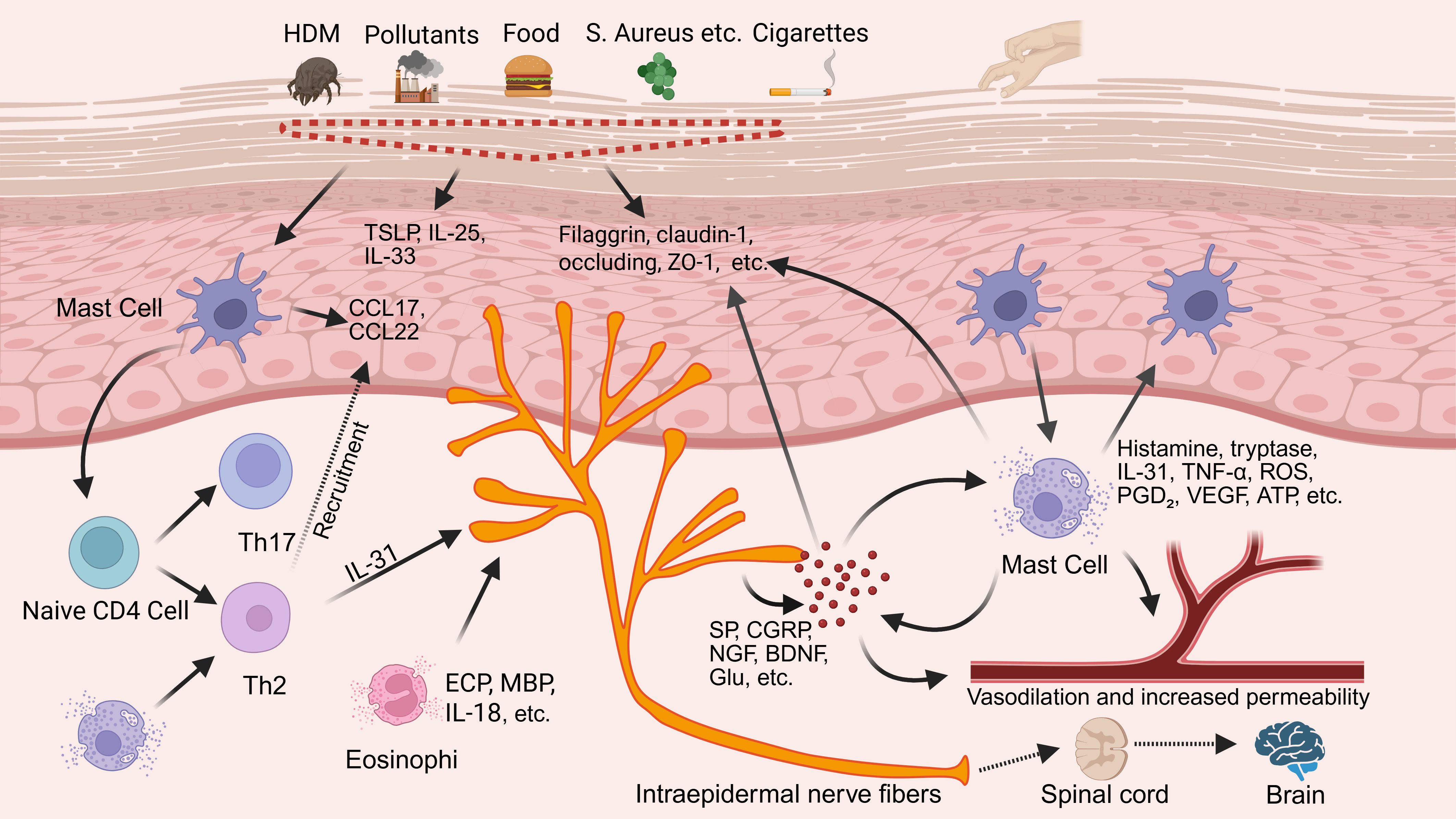 Epidermal barrier dysfunction is a critical initiating factor in the pathogenesis of chronic pruritus in AD, and the mast cell–neuron axis plays an active role not only in responding to external insults but also in perpetuating barrier disruption and impaired repair (14, 15).