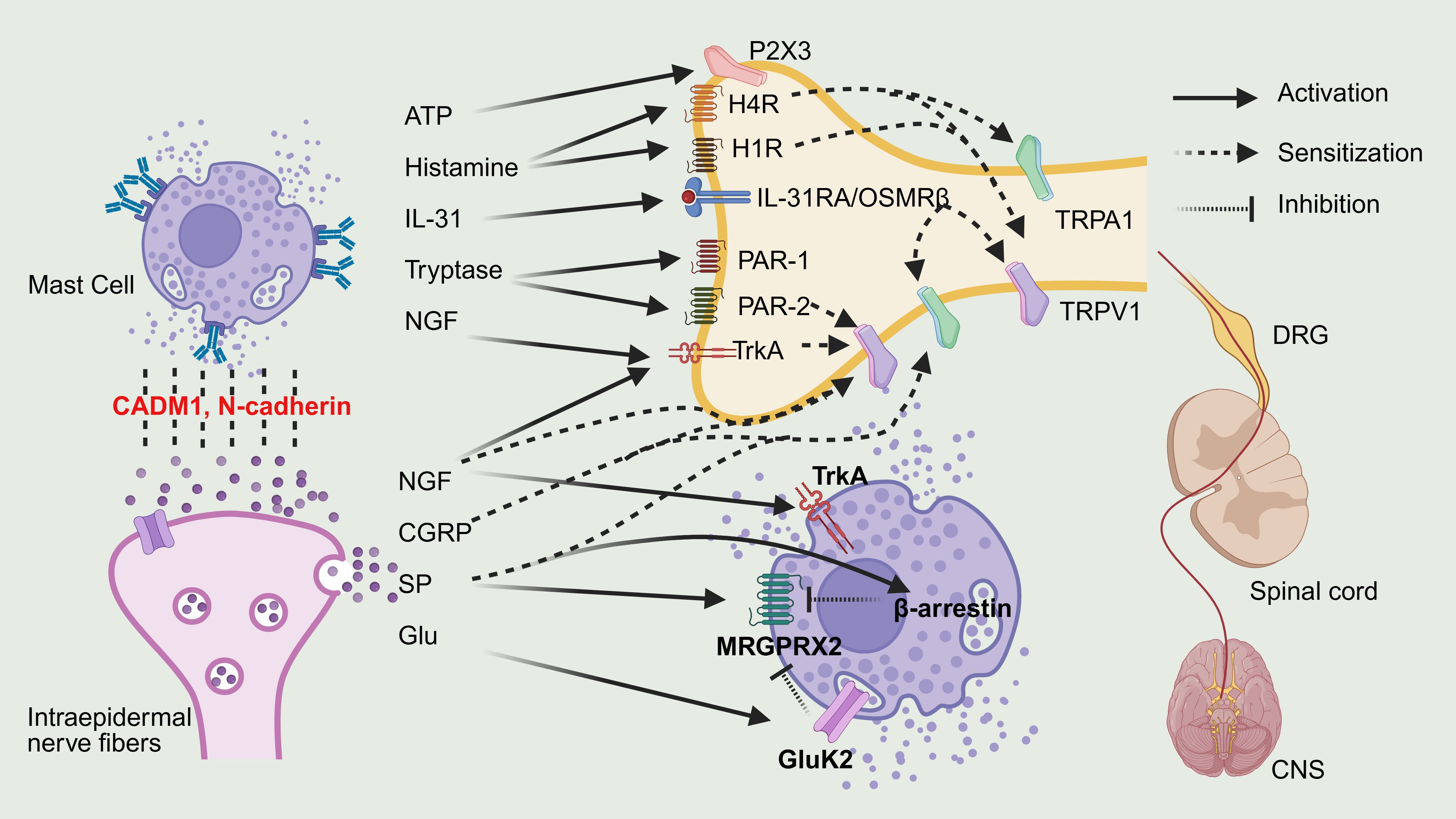 The bidirectional communication between mast cells and sensory neurons and their signaling pathways are illustrated in Figure 2.