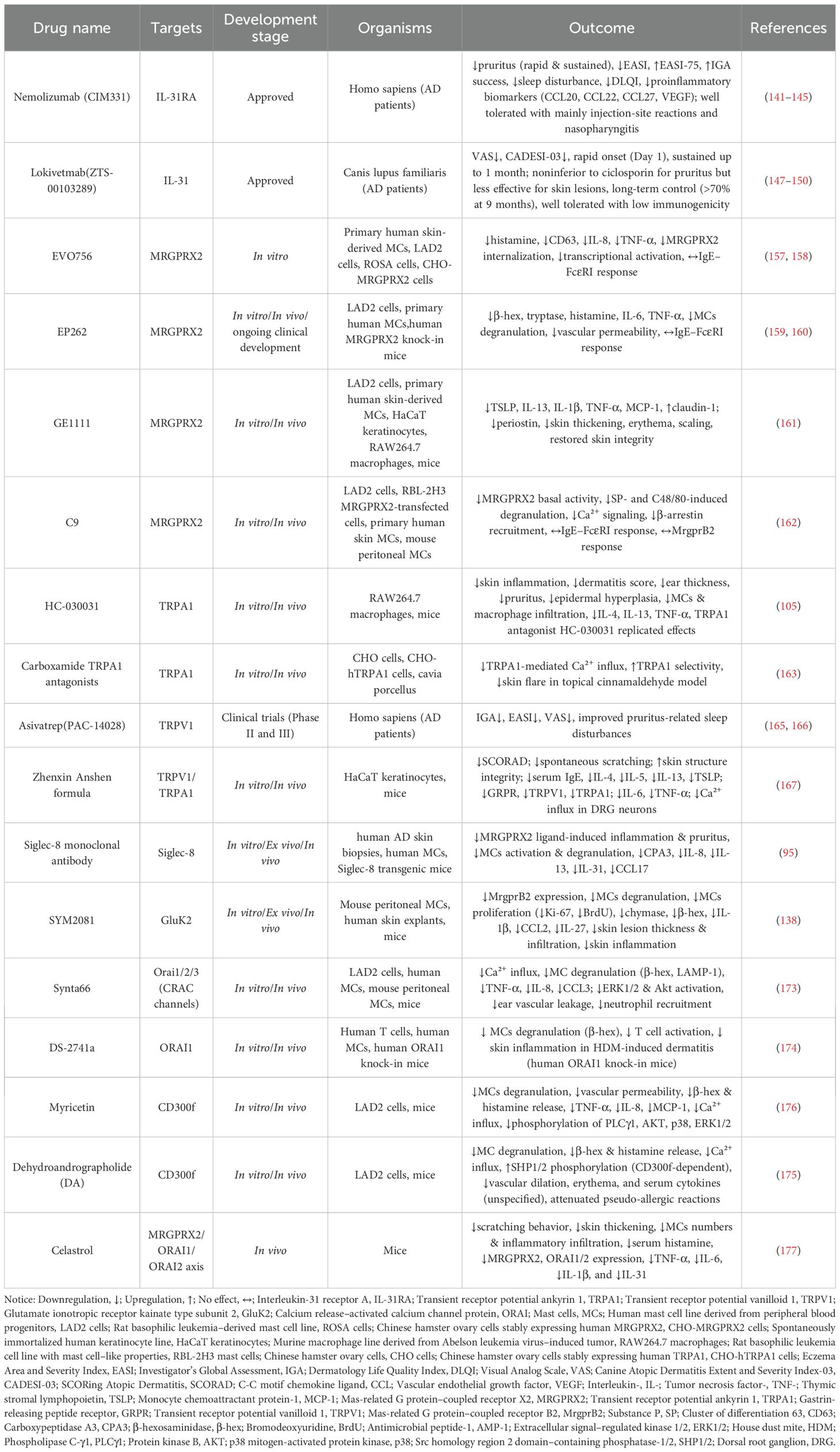 Nemolizumab, a humanized immunoglobulin G2(IgG2) monoclonal antibody targeting IL-31RA, was specifically developed to inhibit IL-31 signaling within the mast cell–neuron axis and entered clinical development in 2016 (140). Subsequent clinical studies have consistently demonstrated its efficacy in alleviating moderate-to-severe AD–associated pruritus.