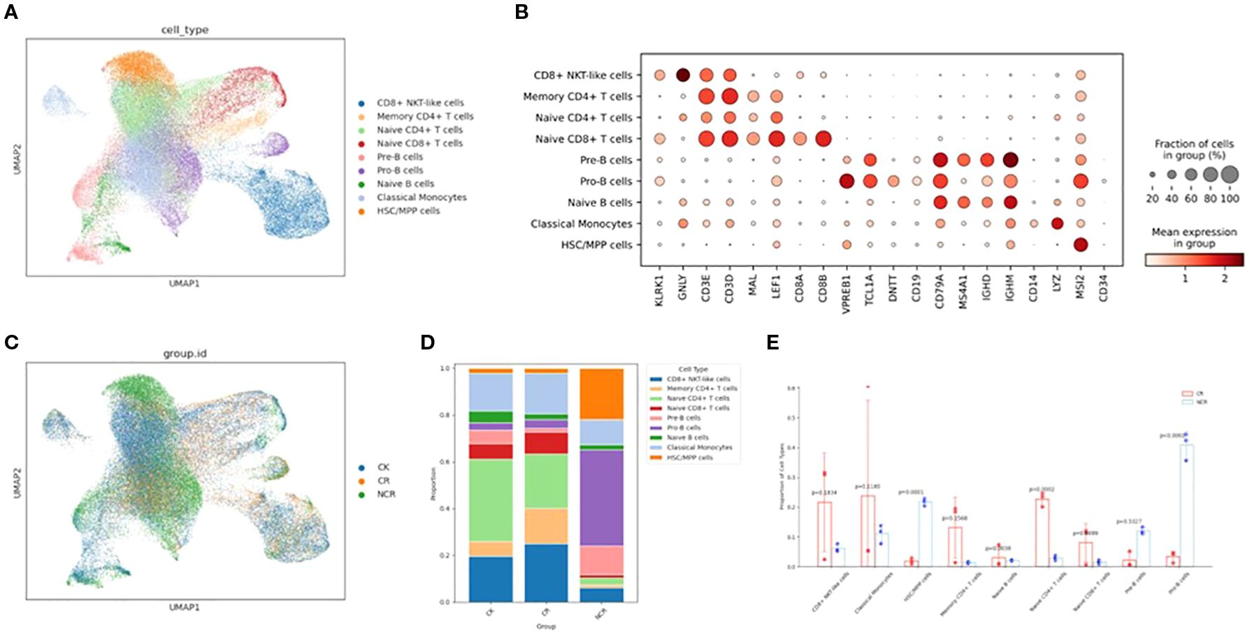 A panel of five scientific figures related to cell type analysis:  A: UMAP plot showing various cell types such as CD8+ NKT-like cells, Memory CD4+ T cells, color-coded for differentiation.  B: Dot plot illustrating mean expression of genes across different cell types, with dot size indicating cell group fraction.  C: UMAP plot displaying group divisions labeled CK, CR, and NCR, each group in a distinct color.  D: Bar chart comparing proportions of different cell types across three groups.  E: Bar graph analyzing the proportions of specific cell types between groups CR and NCR, with p-values included.