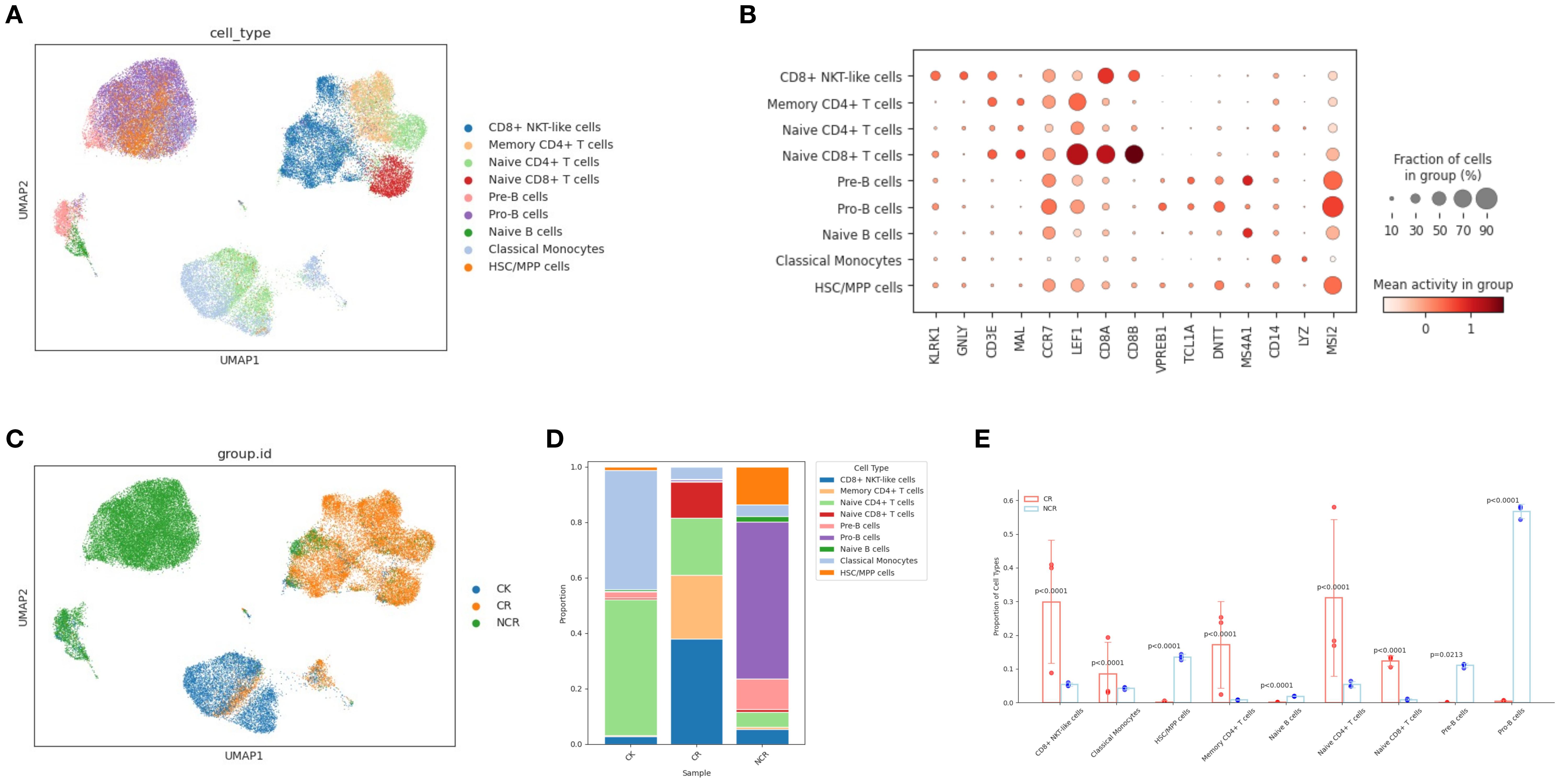 We then analyzed the relative proportions of cell clusters (Figures 1C, D). The cellular composition of the ALL remission group (CR group) is similar to that of the normal group (CK), with naïve CD4 T cells and CD8+ NKT-like cells being predominant. However, the cellular composition of the non-remission group (NCR group) is significantly different from the CR group, characterized by the highest proportion of Pro-B cells (p<0.0001), a marked increase in HSC/MPP cells (p=0.0001), and a significant decrease in naïve CD4 T cells (p=0.0002) and naïve B cells(Figure 1E).