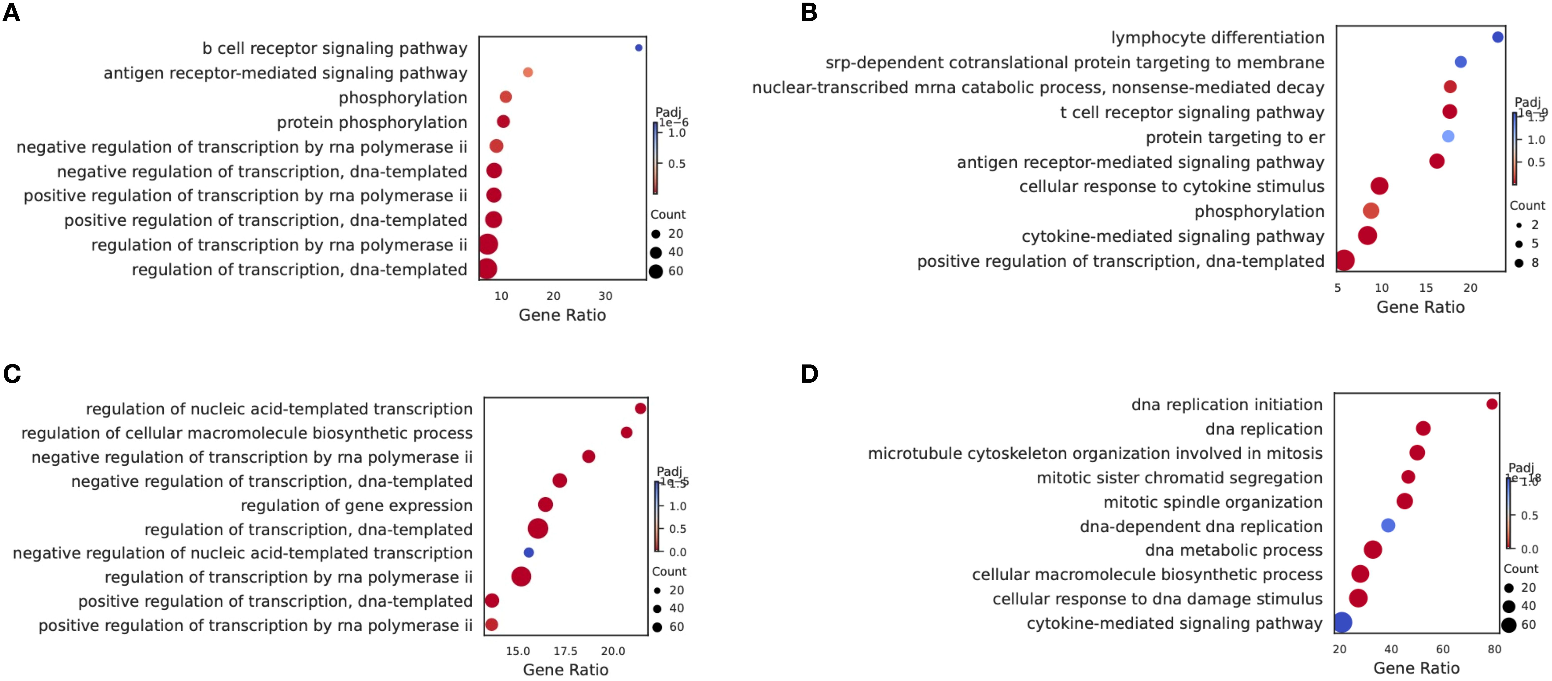 Four bubble plots labeled A, B, C, and D display gene enrichment analysis results. Each plot lists biological terms on the y-axis and the gene ratio on the x-axis. The size of the bubbles represents the count of genes, and their color indicates the adjusted p-value (Padj), with a gradient from red to blue. A key indicates both the bubble size and color significance.