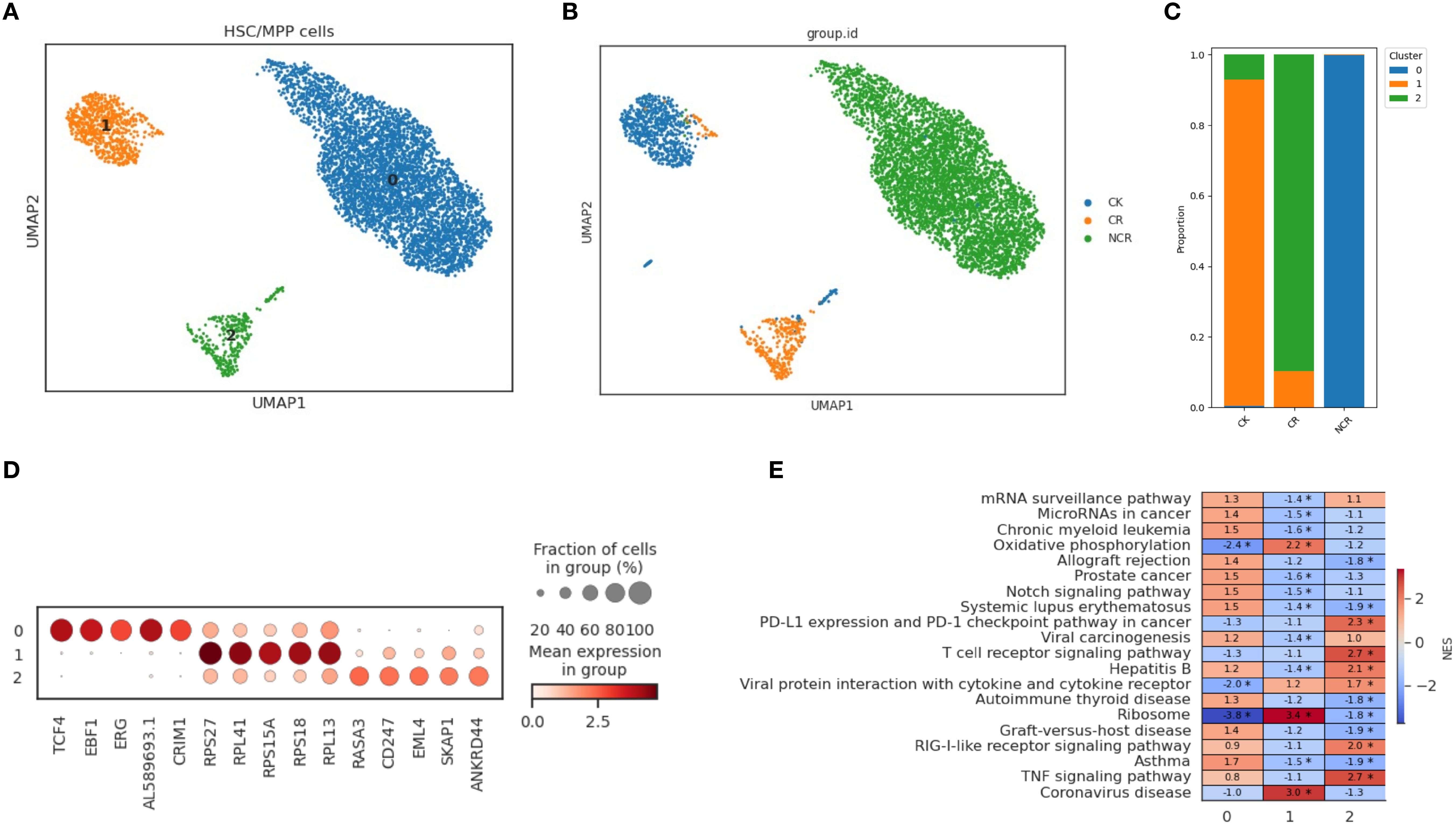 Figure 4. Spectral clustering of HSC/MPP cells. (A) Three main HSC/MPP cell subclusters were identified by UMAP analysis. (B) UMAP plots of HSC/MPP cells in the CK, CR and NCR groups. (C) The bar chart shows the proportions of each subclusters of HSC/MPP cells in the CK, CR and NCR groups. (D) Dot plots show the expression levels of top 5 DEGs across the three HSC/MPP subclusters. (D) GO analysis of DEGs in the three HSC/MPP subclusters. (E) Heatmap showing normalized enrichment scores (NES) of enriched pathways across HSC/MPP clusters, with color scale indicating relative pathway activity.