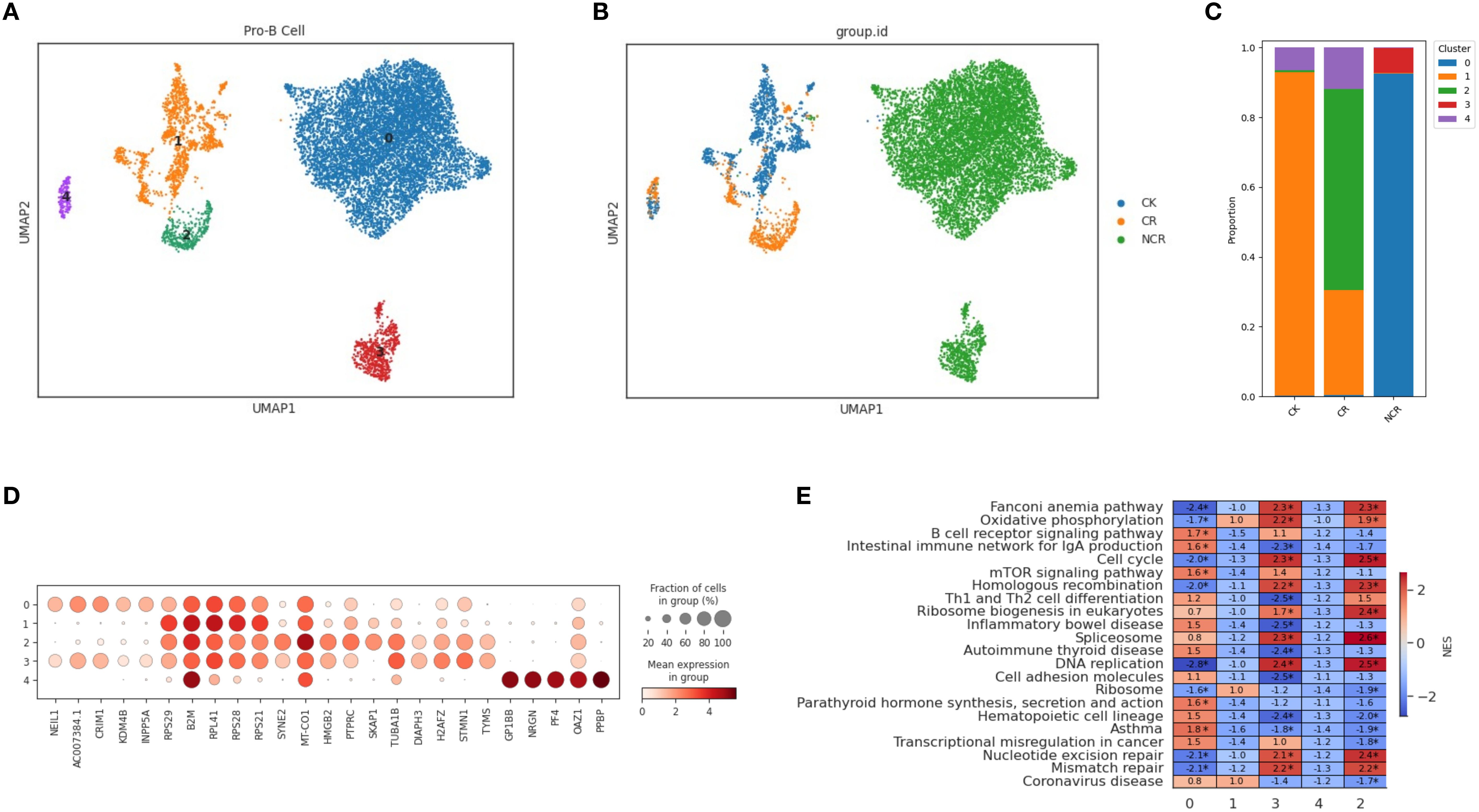 Figure 5. Spectral clustering of Pro-B cells. (A) Five main Pro-B cell subclusters were identified by UMAP analysis. (B) UMAP plots of Pro-B cells in the CK, CR and NCR groups. (C) The bar chart shows the proportions of each subclusters of Pro-B cells in the CK, CR and NCR groups. (D) Dot plots show the expression levels of top 5 DEGs across the three Pro-B subclusters. (D) GO analysis of DEGs in the five Pro-B subclusters. (E) Heatmap showing normalized enrichment scores (NES) of enriched pathways across Pro-B cell clusters, with color scale indicating relative pathway activity.
