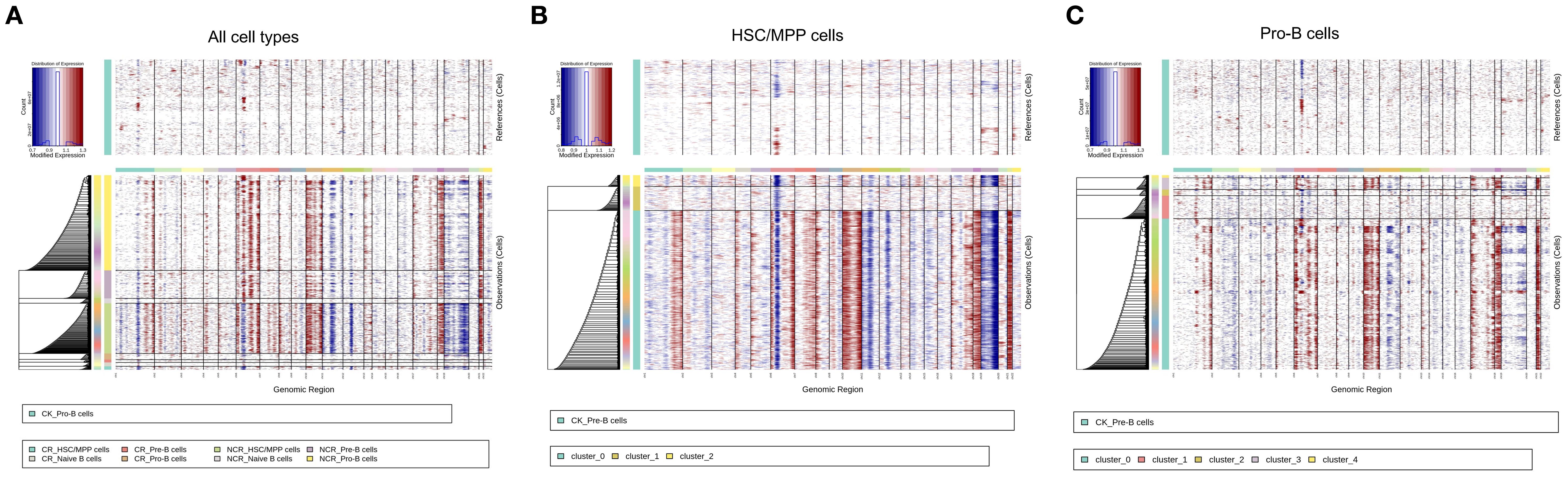Figure 6. Copy number variation (CNV) analysis of all cell types (A), HSC/MPP cells (B) and Pro-B cells (C).