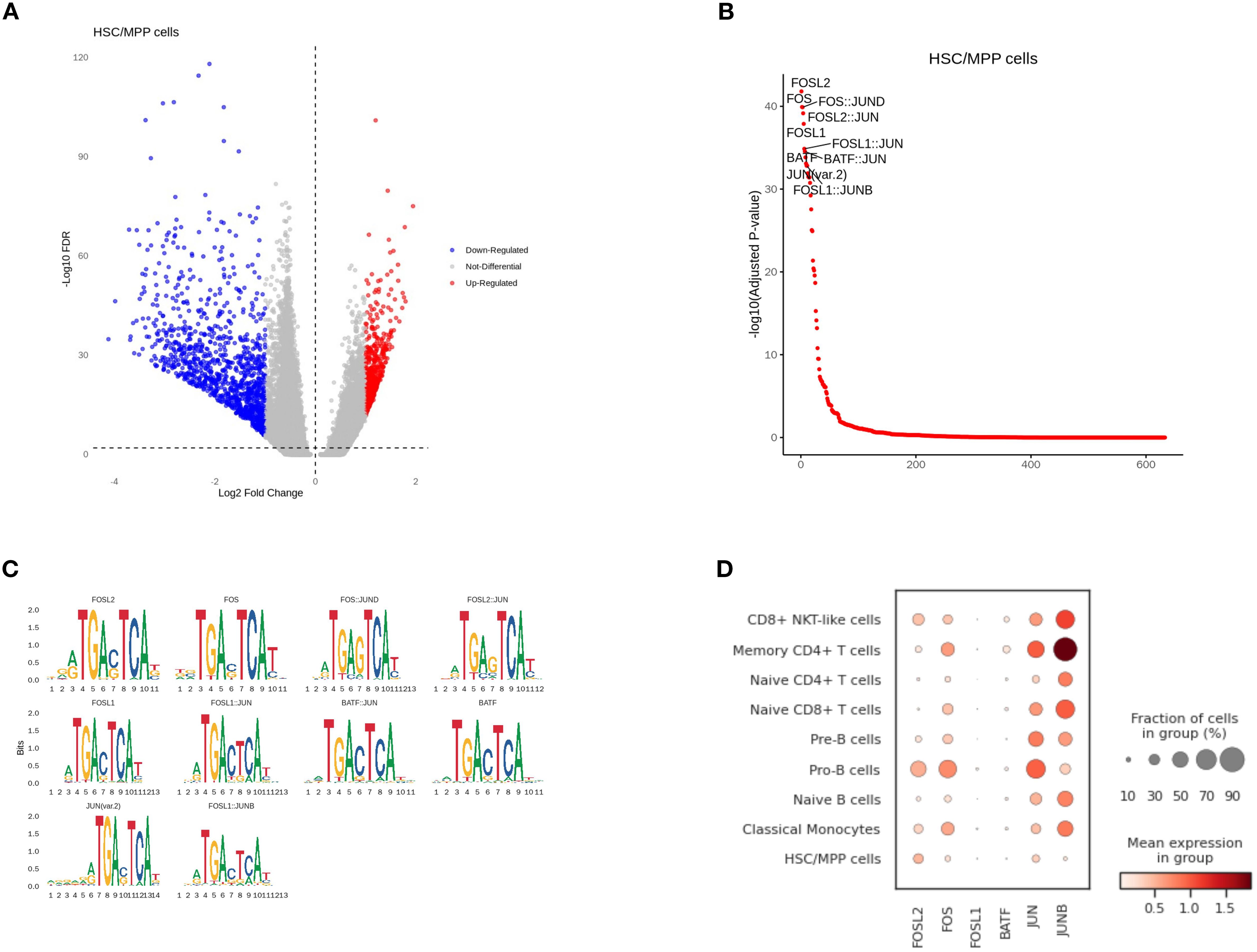 Panel A shows a volcano plot of HSC/MPP cells with log2 fold change on the x-axis and -log10 FDR on the y-axis. Blue dots indicate down-regulated genes, red dots indicate up-regulated genes, and gray dots represent not-differentially expressed genes. Panel B presents a scatter plot of adjusted P-values for gene expressions, highlighting FOSL2 and related genes in HSC/MPP cells. Panel C contains sequence logos for transcription factor binding motifs, including FOSL2 and JUN variants. Panel D illustrates a dot plot showing mean expression and fraction of cells for various immune cell types, such as CD8+ and memory CD4+ T cells, across different genes.