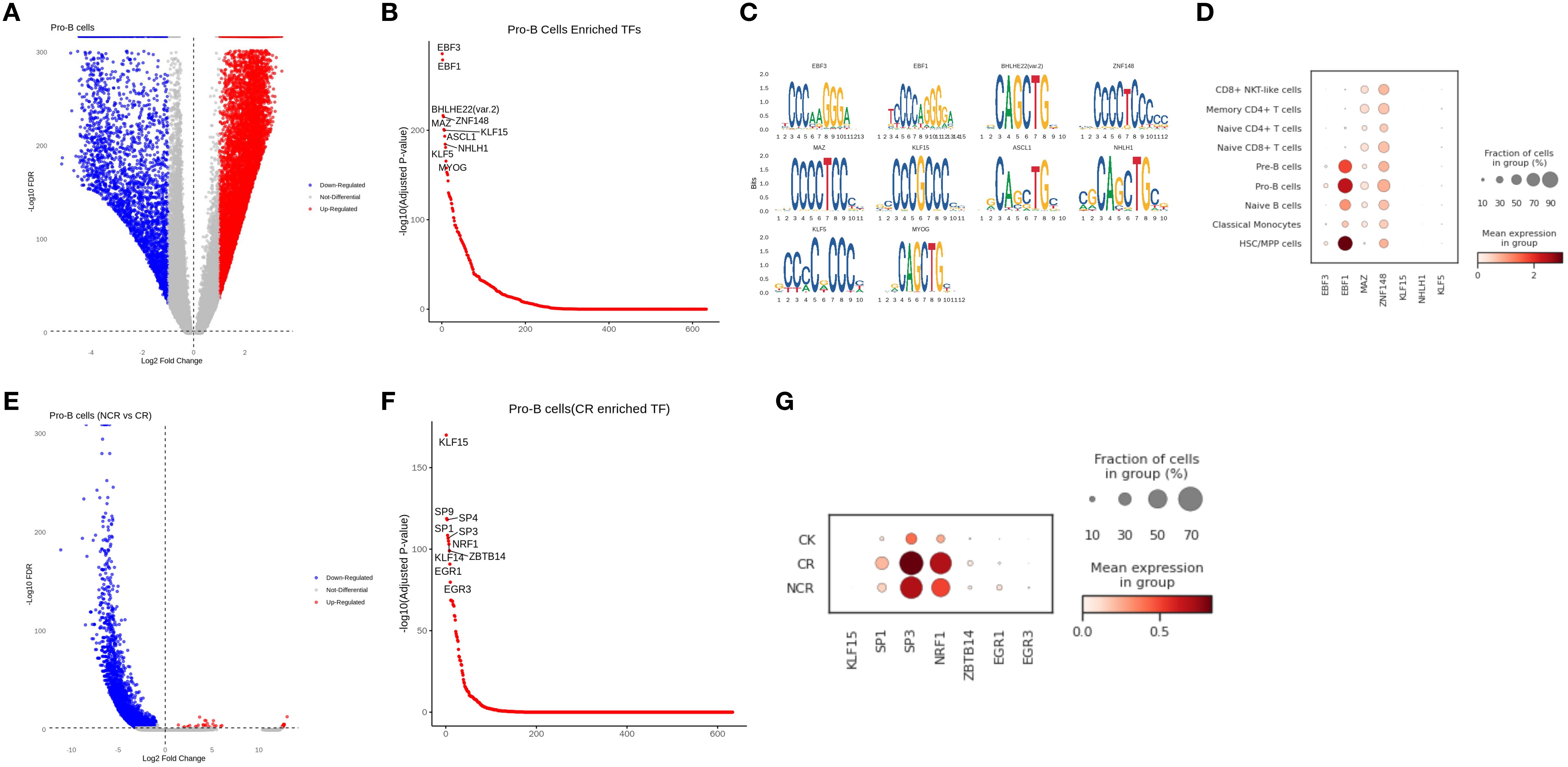 The analysis of the Pro-B subgroup in scATAC-seq showed that the binding sites of EBF3, EBF1, MAZ, ZNF148, KLF15, NHLH1, and KLF5 had higher accessibility in Pro-B cells than in other cell types (Figures 8A-C). We further analyzed the expression differences of these genes in scRNA-seq and found that EBF1 and ZNF148 were highly expressed in Pro-B cells (Figure 8D). When comparing Pro-B cells between NCR and CR groups, the differential peaks in NCR were mainly downregulated, which means they were predominantly enriched in the CR group (Figure 8E). We found that the accessibility of KLF15, SP1, SP3, NRF1, ZBTB14, EGR1, EGR3 binding sites in Pro-B was higher in the CR group than in the NCR groups (Figure 8F). Among them, SP1, SP3, NRF1 also showed higher expression levels in scRNA-seq in the CR group compared to the NCR group, which is consistent with scATAC-seq (Figure 8G).