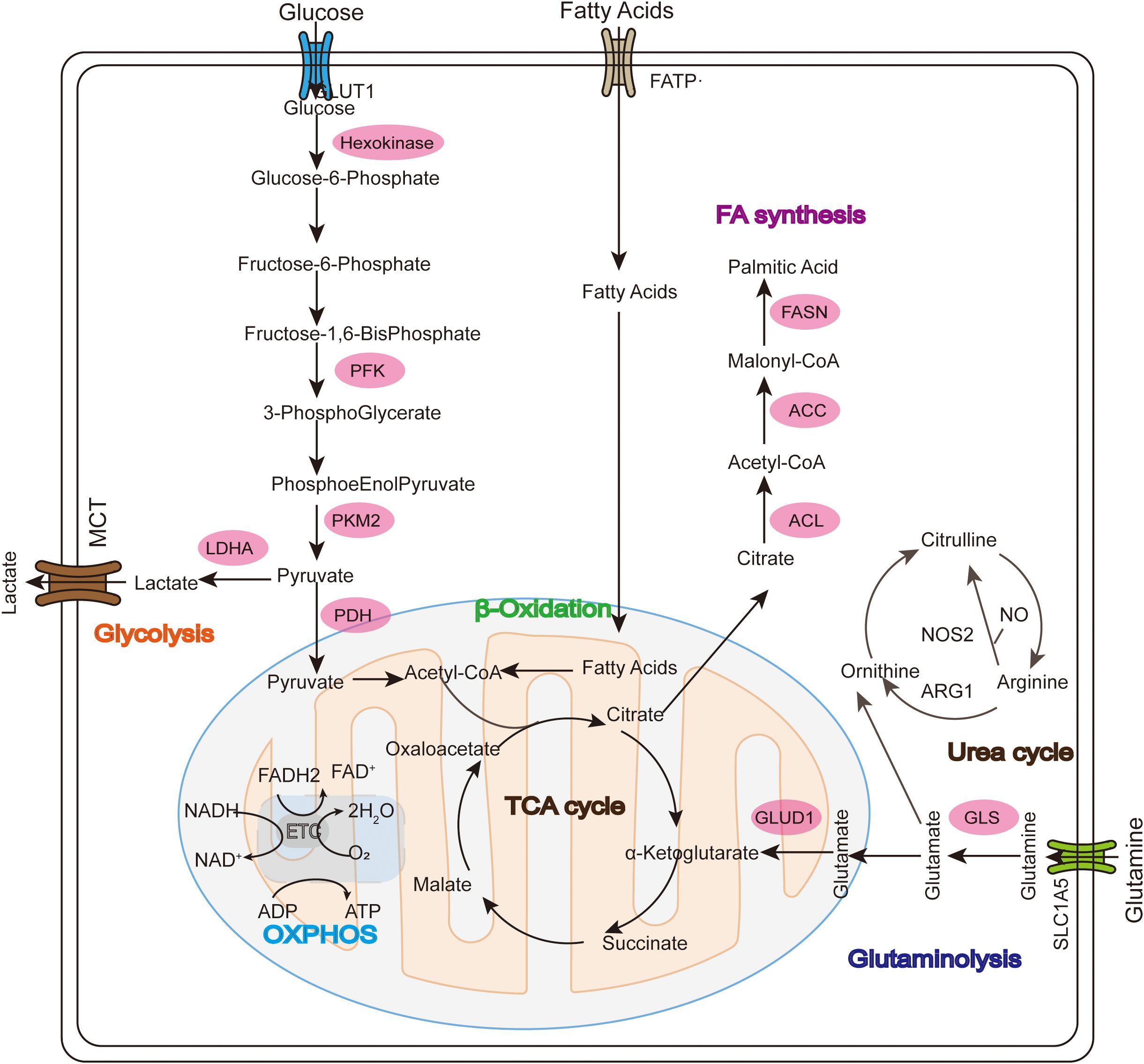 Figure 1. Glucose, fatty acid, and glutamine metabolism in mitochondria during tumor development. In the Warburg effect, unlike normal differentiated cells, glucose enters the cell through GLUT1 and mainly relies on mitochondrial oxidative phosphorylation to provide energy for the cell, while most tumor cells rely on aerobic glycolysis and are eventually oxidized to lactate instead of acetyl-CoA (ac-COA). The main substrate for lipid synthesis is cytoplasmic acetyl-CoA synthesized through a series of reactions. Fatty acid oxidation (FAO) allows long-chain FA to be converted into acetyl-CoA in the mitochondria and enter the TCA cycle to generate ATP and malic enzyme-dependent NADPH. Glutamate is then converted into α-ketoglutarate (α-KG) through two different pathways and can participate in the TCA cycle as a replenishing substrate. Glutamine sequentially catalyzes the formation of arginine (Arg) through citrulline (Cit), and then continues to decompose under the action of arginase (ARG) to produce urea and ornithine (Orn), thus forming the urea cycle.