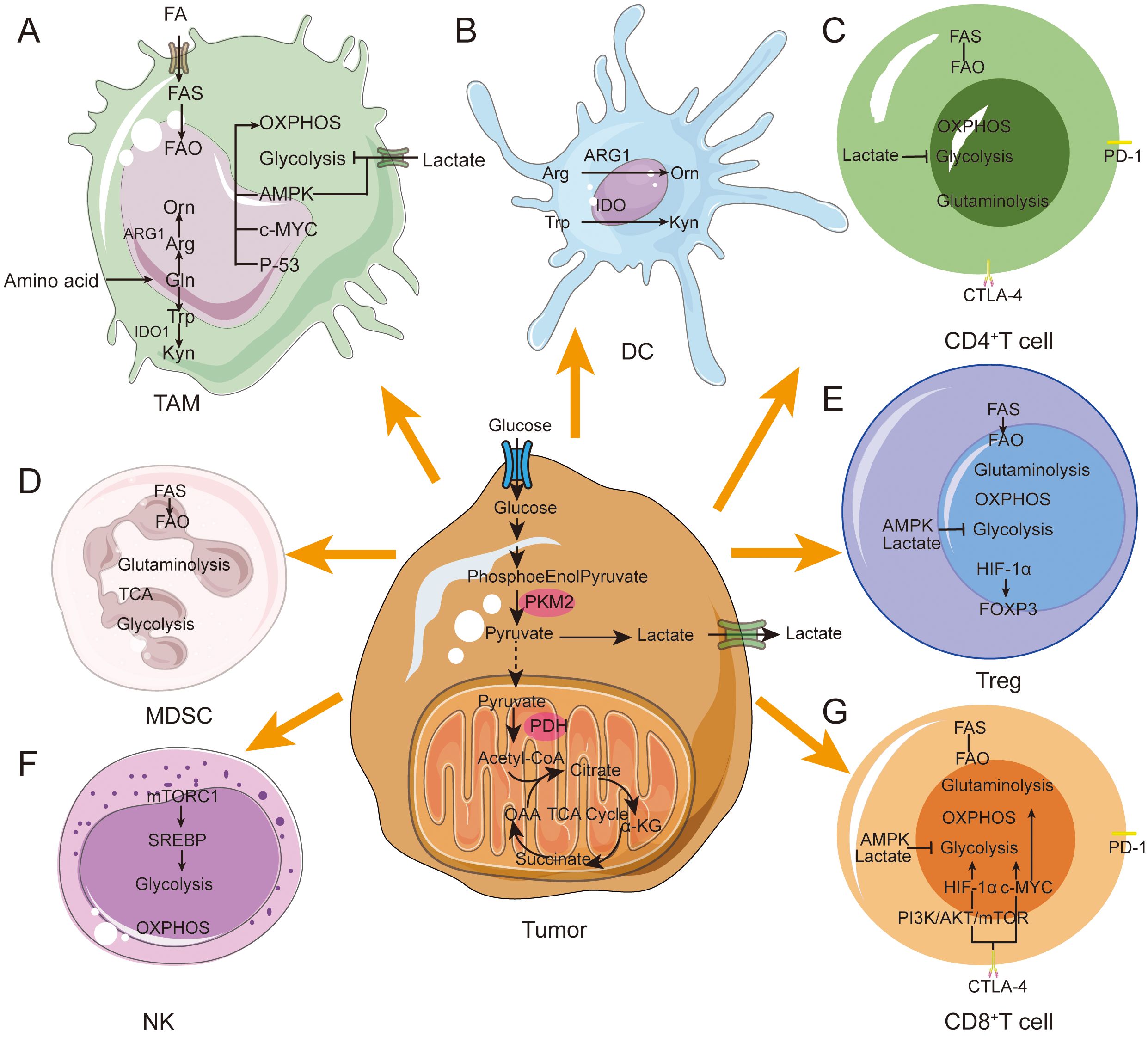 Figure 2. Metabolic reprogramming in immune cells during tumor progression. Immune cells in the TME achieve immunosuppressive and pro-tumor phenotypes through metabolic reprogramming. (A) M1 macrophages prefer glycolysis and secrete a large amount of lactate. M2 macrophages tend to show enhanced fatty acid oxidative phosphorylation ability. M2 macrophages mainly rely on FAO, OXPHOS and glutamine metabolism. (B) Immediately after DC activation, glycolysis increases rapidly to provide ATP. DCs express ARG1 and IDO enzymes. Hydrolyze arginine and tryptophan. (C) High lactate concentration blocks CD4+ T cell glycolysis. CD4+ T cells increase lipid uptake leading to a metabolic shift toward FAO. (D) MDSCs express ARG1 and IDO enzymes. Hydrolyze arginine and tryptophan. Tumor-infiltrating MDSCs exhibit enhanced glycolysis and OXPHOS. (E) In Tregs, FOXP3 expression inhibits glycolysis while promoting OXPHOS. FASN overexpression enhances lipid metabolism. (F) NK-mediated glycolysis via mTORC1 signaling. and OXPHOS. (G) High lactate concentrations block T cell glycolysis. Activated CD8+ T cells convert glucose and glutamine into biomass and rely on the Pl3K and AKT pathways. CD8+ T cells tend to FAO increase lipid uptake.