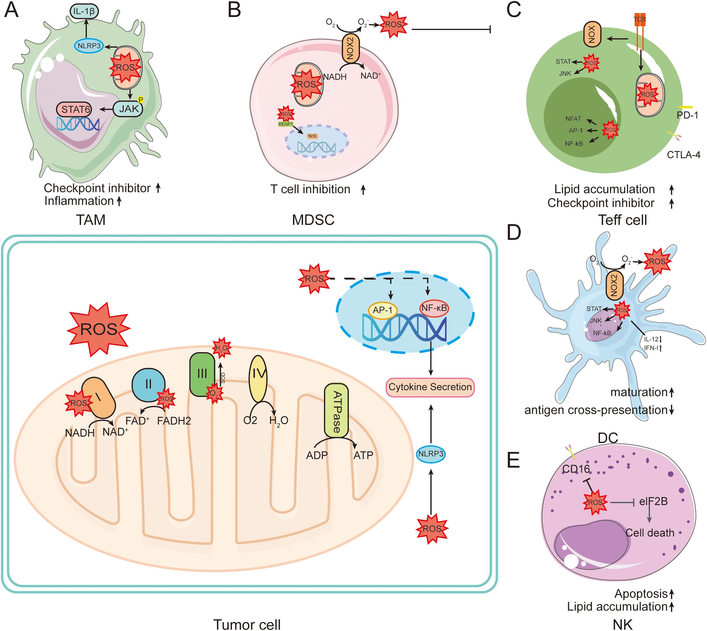 Figure 3. Role of ROS in tumors and immune cells. ROS are mainly generated in the electron transport chain on the inner membrane of mitochondria during oxidative phosphorylation. This leads to intracellular oxidative stress. (A) In macrophages, ROS induce powerful intracellular changes by activating signaling pathways such as NF-kB, AP-1, and NRF2. Activation of NF-kB and AP-1 leads to the production of key pro-inflammatory cytokines. (B) NOX family members in MDSC cells directly mediate the production of ROS, further promoting the inflammatory cascade. (C) TCR engagement can mediate the production of ROS through NOX family members, increasing the activity of NFAT, Myc, and mTOR. (D) ROS can affect DC maturation, antigen presentation, NF-κB activation, and induction of anti-inflammatory cytokines. (E) ROS induced in NK promotes NK cell apoptosis.