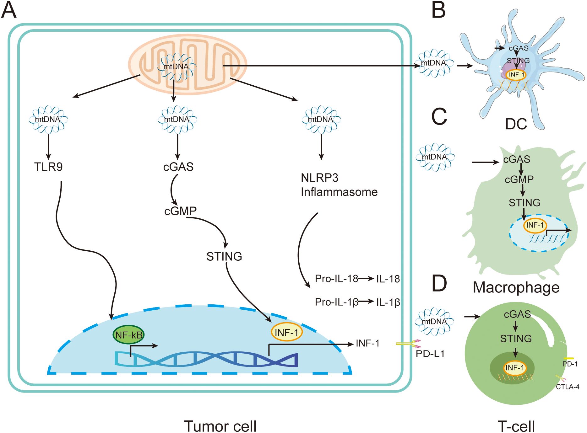 Figure 4. Immune regulation by mtDNA in tumors cells. (A) Mitochondria can release mtDNA in response to external or endogenous stress. The released mtDNA triggers various pro-inflammatory signaling pathways through TLR9, cGAS-STING, or through the cytoplasmic inflammasome NLRP3. (B) mtDNA released by tumor cells is transferred to DC cells, stimulating the activation of the cGAS-STING pathway and leading to the release of type I interferons. (C) mtDNA released by tumor cells is transferred to DC cells, stimulating the activation of the cGAS-STING pathway and leading to the release of type I interferons, inducing immunosuppressive M2 phenotype macrophages. (D) mtDNA released by tumor cells is transferred to T cells, stimulating the cGAS-STING pathway and leading to the release of type I interferons.