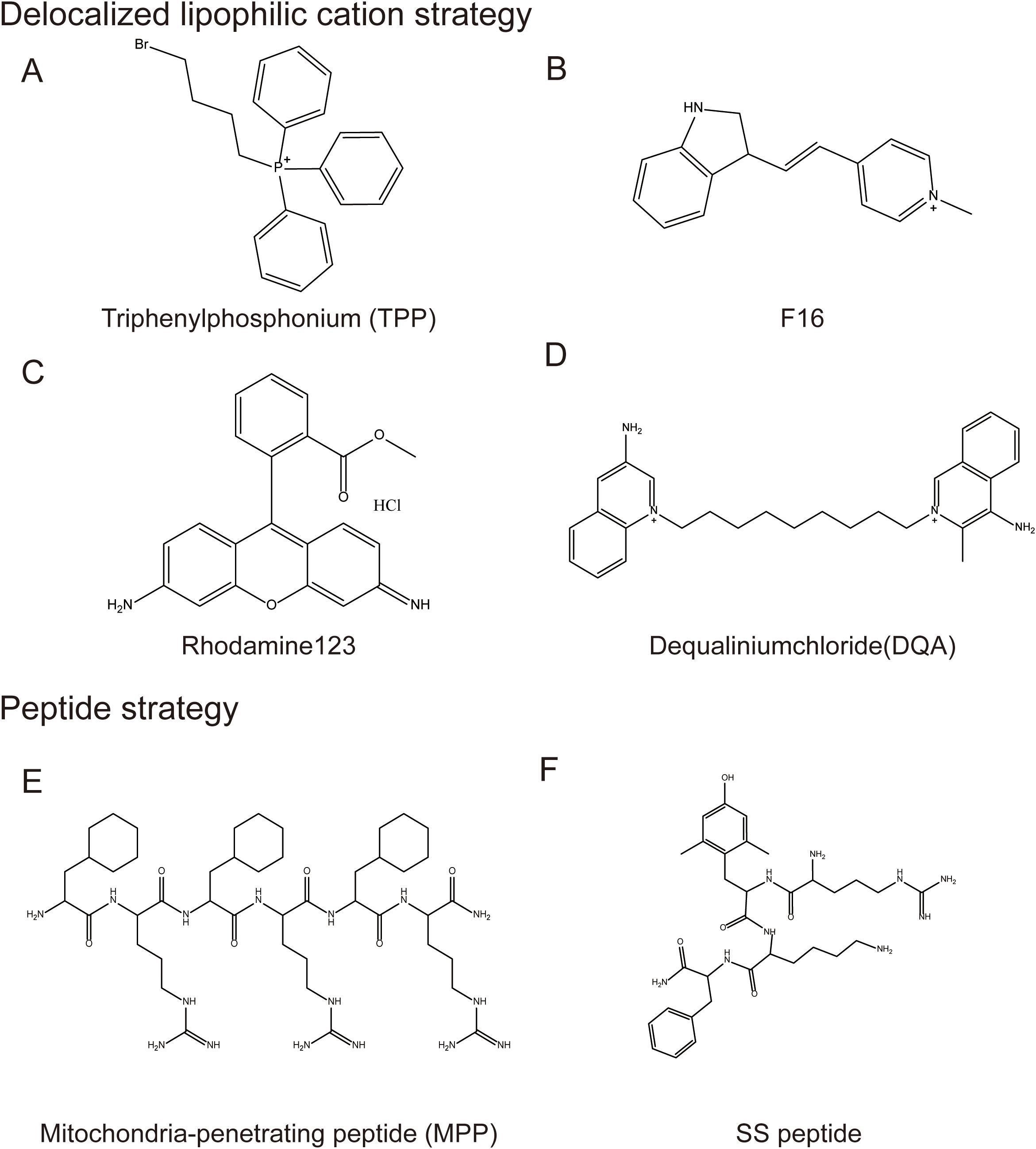 Figure 5. Mitochondrial-targeted structural modification strategies. Typical Mitochondrial-targeted structural modification strategies: 1. Delocalized lipophilic cation strategy, including (A) Triphenylphosphonium, (B) F16, (C) Rhodamine123, (D) Dequaliniumchloride; 2. Peptide strategy including (E) Mitochondria-penetrating peptide and (F) SS peptide.