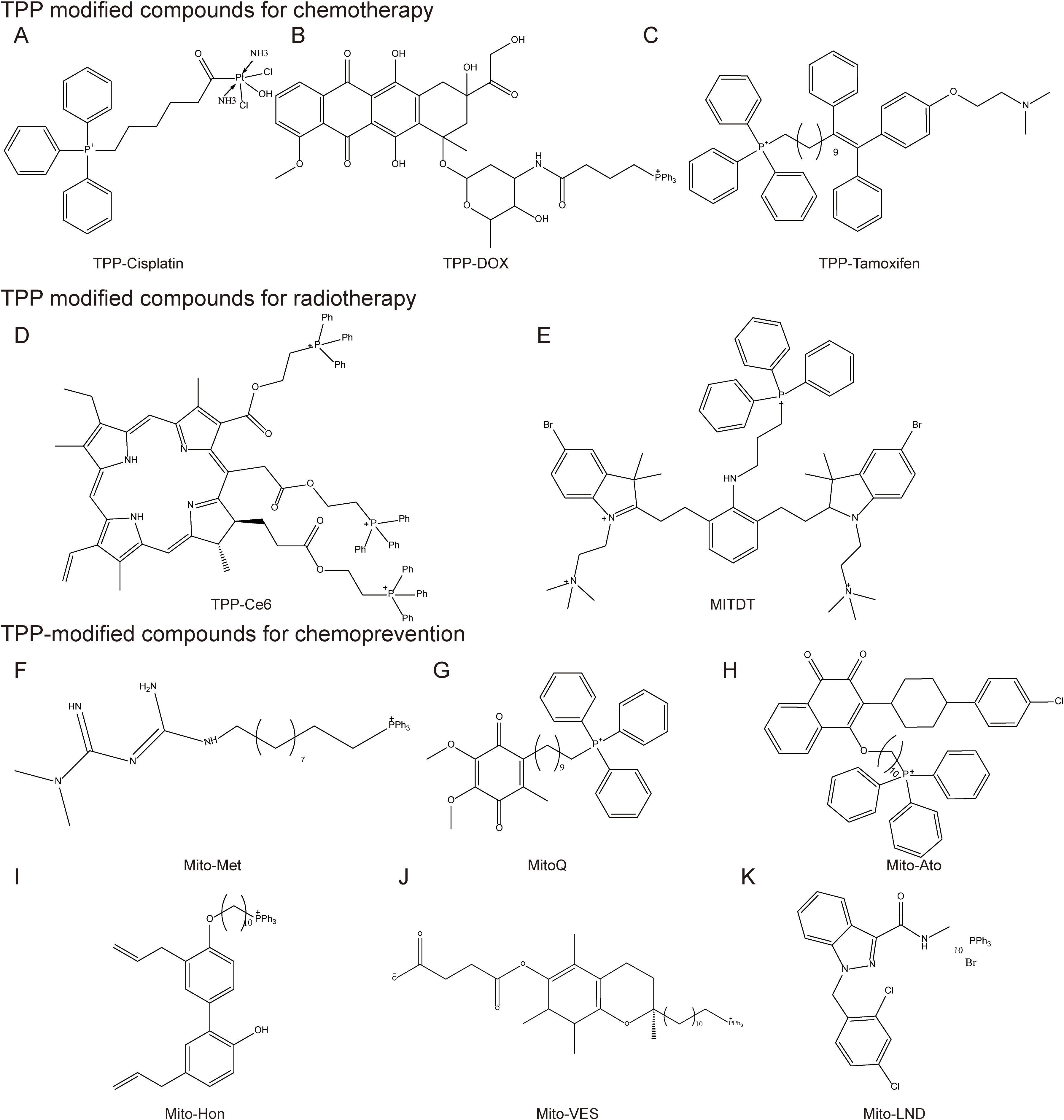 Figure 6. Mitochondrial-targeted triphenylphosphine compounds. TPP modified compounds for chemotherapy include (A) TPP-Cisplatin, (B) TPP-DOX, (C) TPP-Tamoxifen; TPP modified compounds for radiotherapy include (D) TPP-Ce6 (E) MITDT; TPP-modified compounds for chemoprevention, including (F) Mito-Met, (G) MitoQ, (H) Mito-Ato, (I) Mito-Hon, (J) Mito-VES, and (K) Mito-LND.