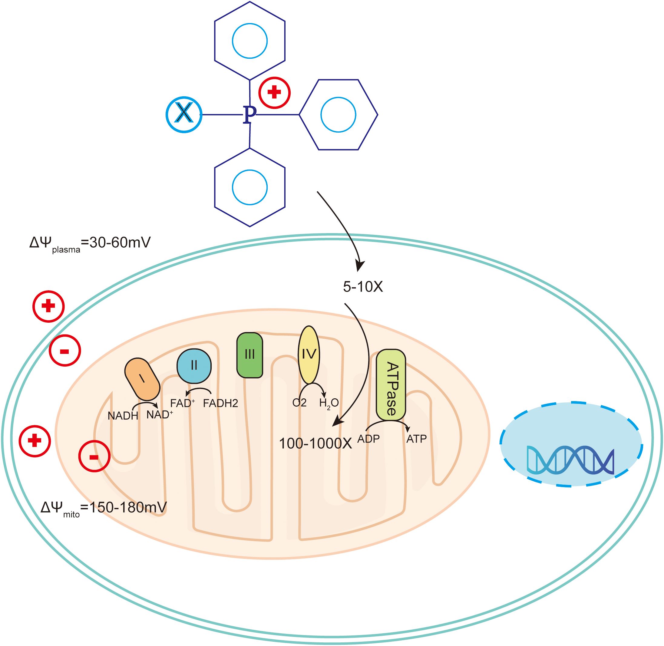 The chemical structure of TPP contains three phenyl groups, which makes it highly lipid-soluble (115). At the same time, the positively charged phosphorus ions can be delocalized to the three benzene rings, allowing them to pass smoothly through the lipid bilayer (116). TPP drives drug accumulation within mitochondria due to the the negative mitochondrial membrane potential (ΔΨm) (117) (Figure 6).