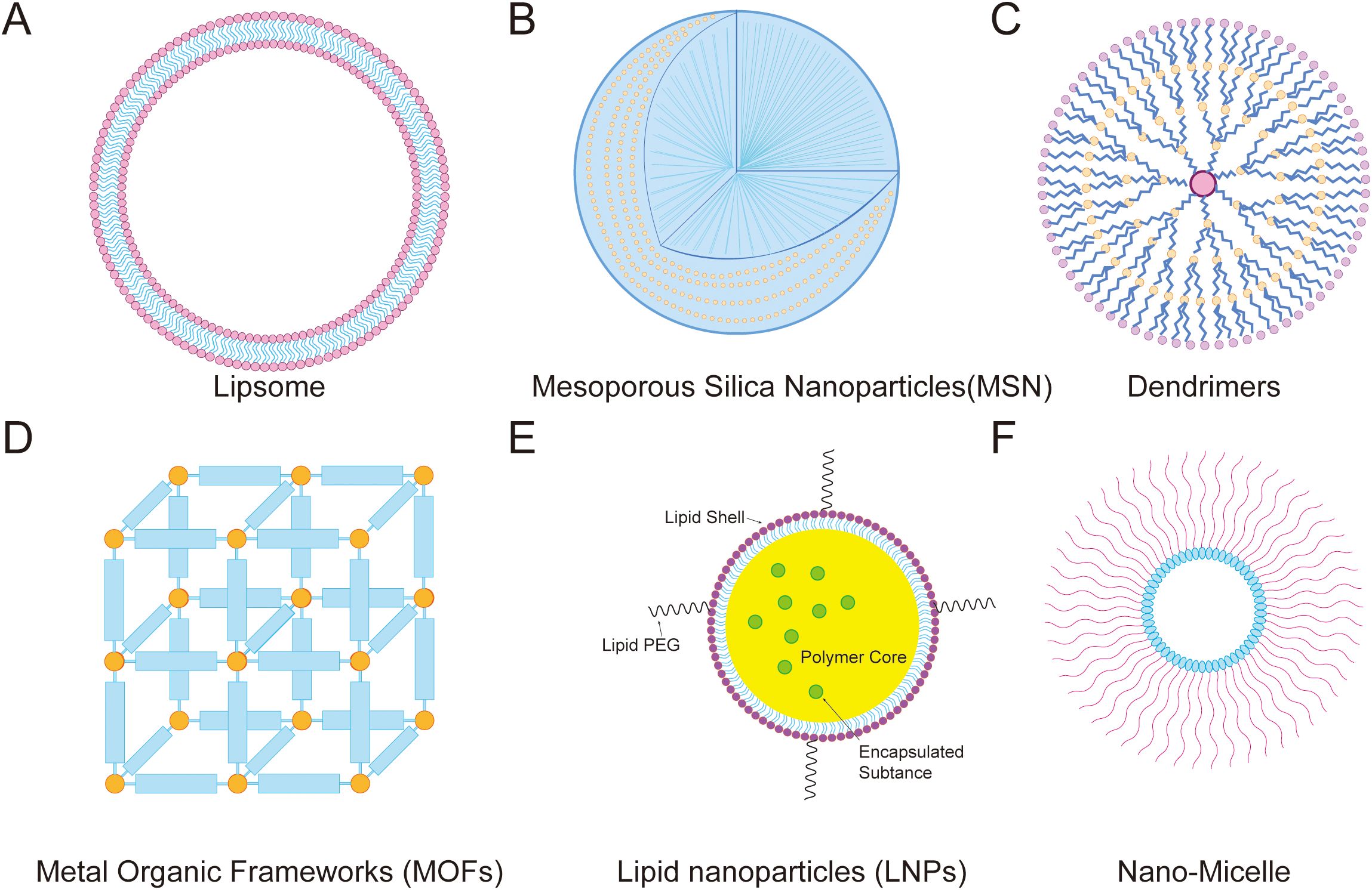 Figure 8. Mitochondrial-targeted nanodrug delivery strategies. (A) Lipsome, (B) Mesoporous Silica Nanoparticles(MSN), (C) Dendrimers, (D) Metal Organic Frameworks (MOFs), (E) Lipid nanoparticles (LNPs), and (F) Nano-Micelle.