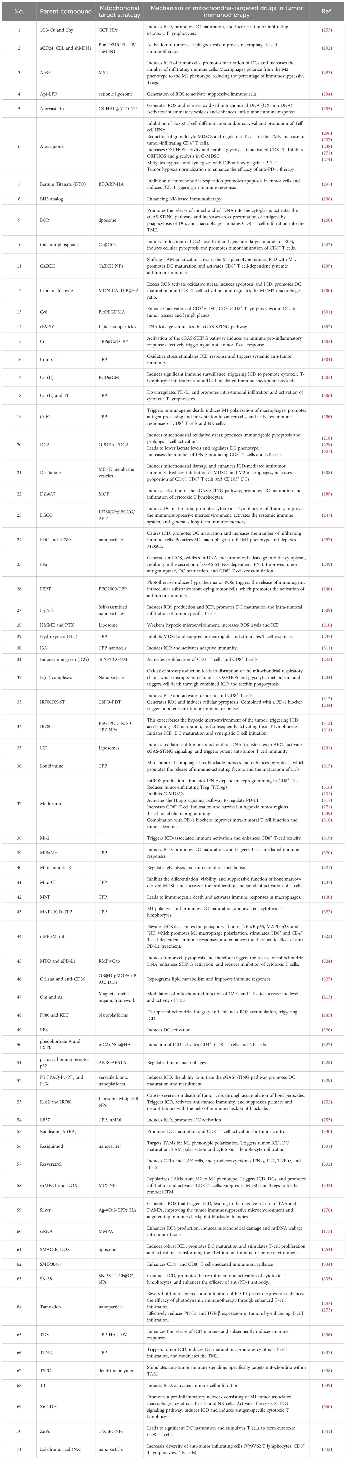 Recent years have witnessed significant advancements in tumor immunotherapy, particularly with the advent of immune checkpoint inhibitors. Nevertheless, many patients exhibit either primary or acquired resistance to such therapies, a phenomenon closely linked to the immunosuppressive nature of the TME (10). Immune cells, such as tumor-associated macrophages (TAMs), rely on mitochondrial metabolic functions to maintain their immunosuppressive activity (11). Therefore, targeted therapies aimed at modulating mitochondrial function may overcome immune resistance by reprogramming immunosuppressive cells (12). For example, recent progress in mitochondrial-targeted metabolic reprogramming has demonstrated that enhancing T-cell bioenergetics can restore antitumor activity (13). Furthermore, mitochondrial-derived ROS modulates immune cell function via redox signaling; low ROS levels promote T-cell exhaustion, whereas normal ROS levels enhance antigen presentation by dendritic cells (DCs) (14). Given the critical role of mitochondria in tumor metabolism and immunotherapy, elucidating how mitochondria-targeting strategies influence tumor immunotherapy represents a promising area of research. In this review, we will explore the emerging role of mitochondria in tumor immunotherapy and discuss the recent advances in mitochondria-targeted drugs that enhance tumor immunity, thereby providing important directions for future therapeutic strategies.