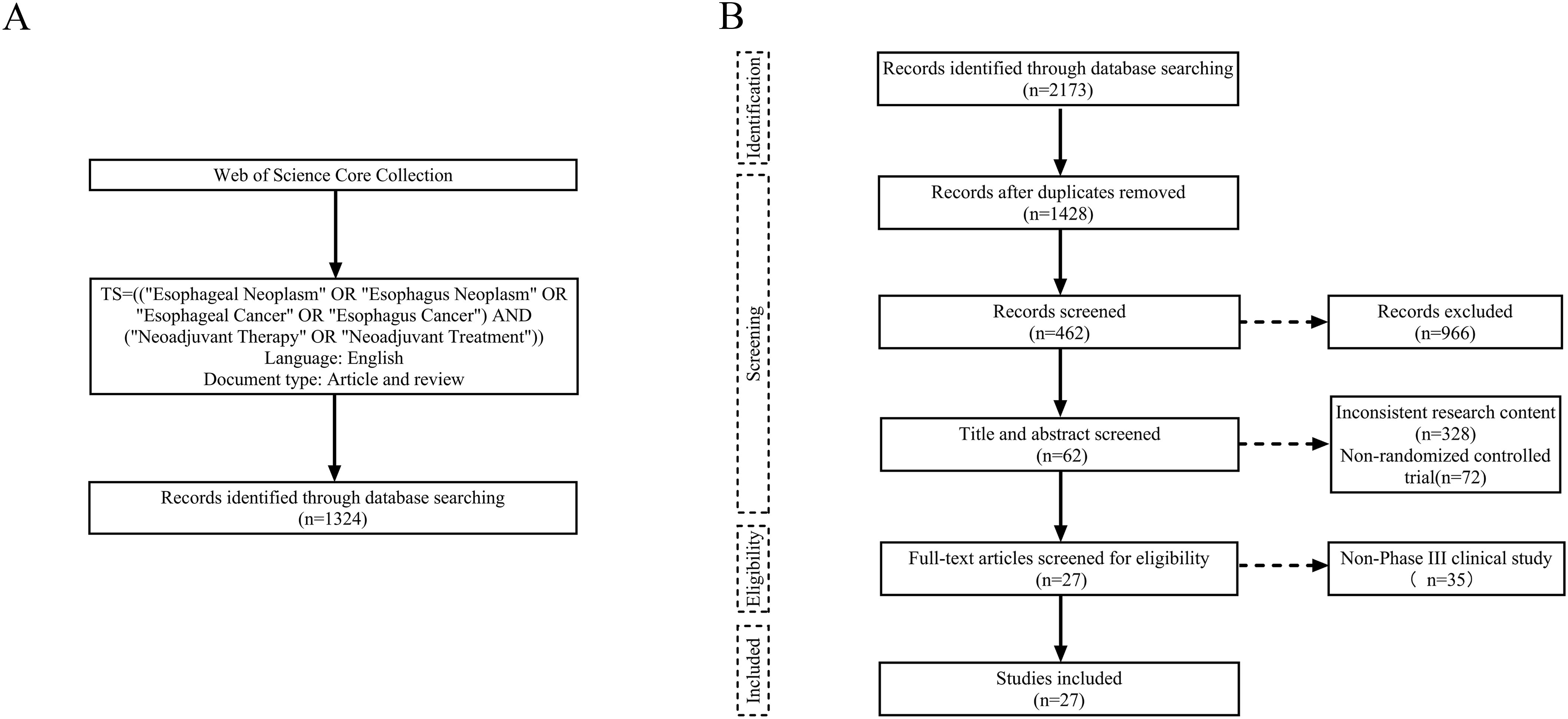 Panel A shows a database search strategy using keywords related to esophageal cancer and neoadjuvant therapy in English article reviews. Panel B is a flowchart illustrating a study selection process. It begins with 2173 records from the database, reducing to 1428 after removing duplicates. Records screened drop to 462, with 966 exclusions. Title and abstract screening narrows it to 62, with 400 rejected for inconsistency or lack of randomization. Full-text screening leaves 27 studies eligible, excluding 35 non-Phase III studies. Ultimately, 27 studies are included.
