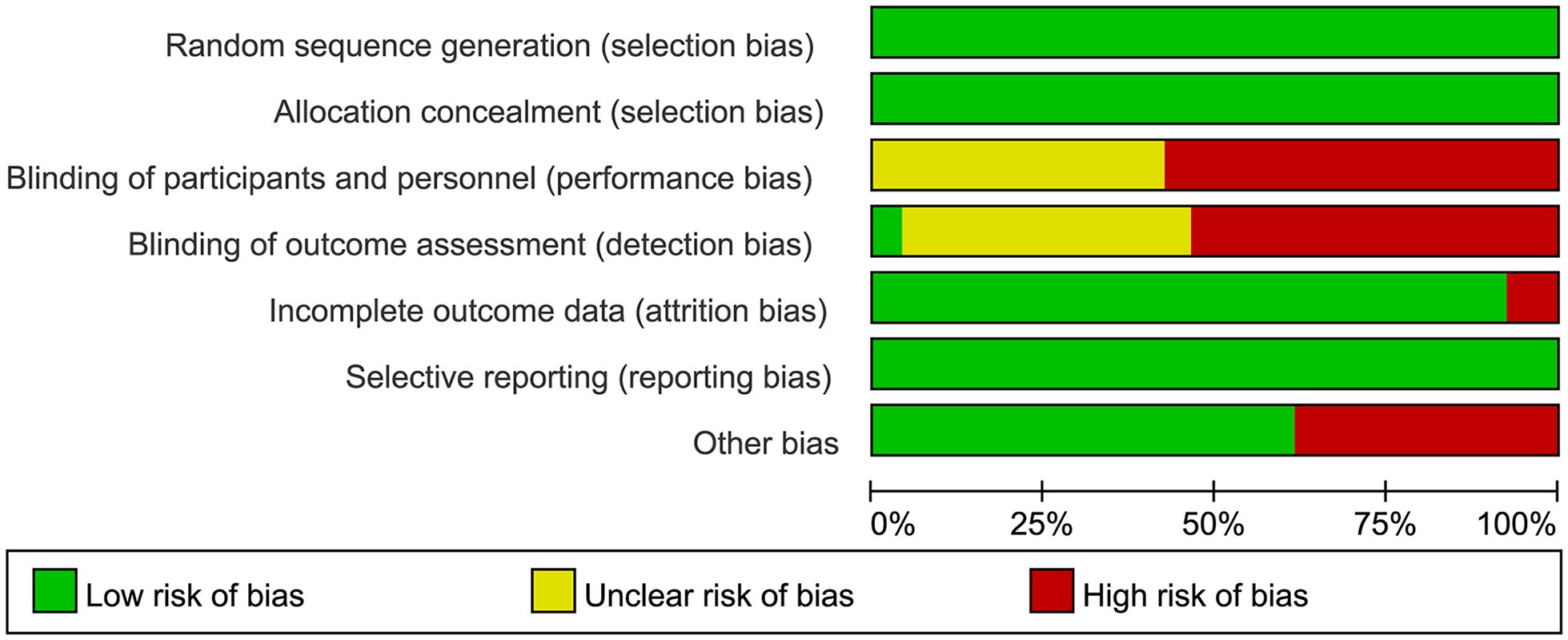 Bar chart displaying risk of bias in various categories: random sequence generation, allocation concealment, blinding of participants and personnel, blinding of outcome assessment, incomplete outcome data, selective reporting, and other bias. The chart uses green for low risk, yellow for unclear risk, and red for high risk. Random sequence generation, allocation concealment, and most others show low risk, blinding of participants and personnel show high and unclear risks, and blinding of outcome assessment shows unclear risk.