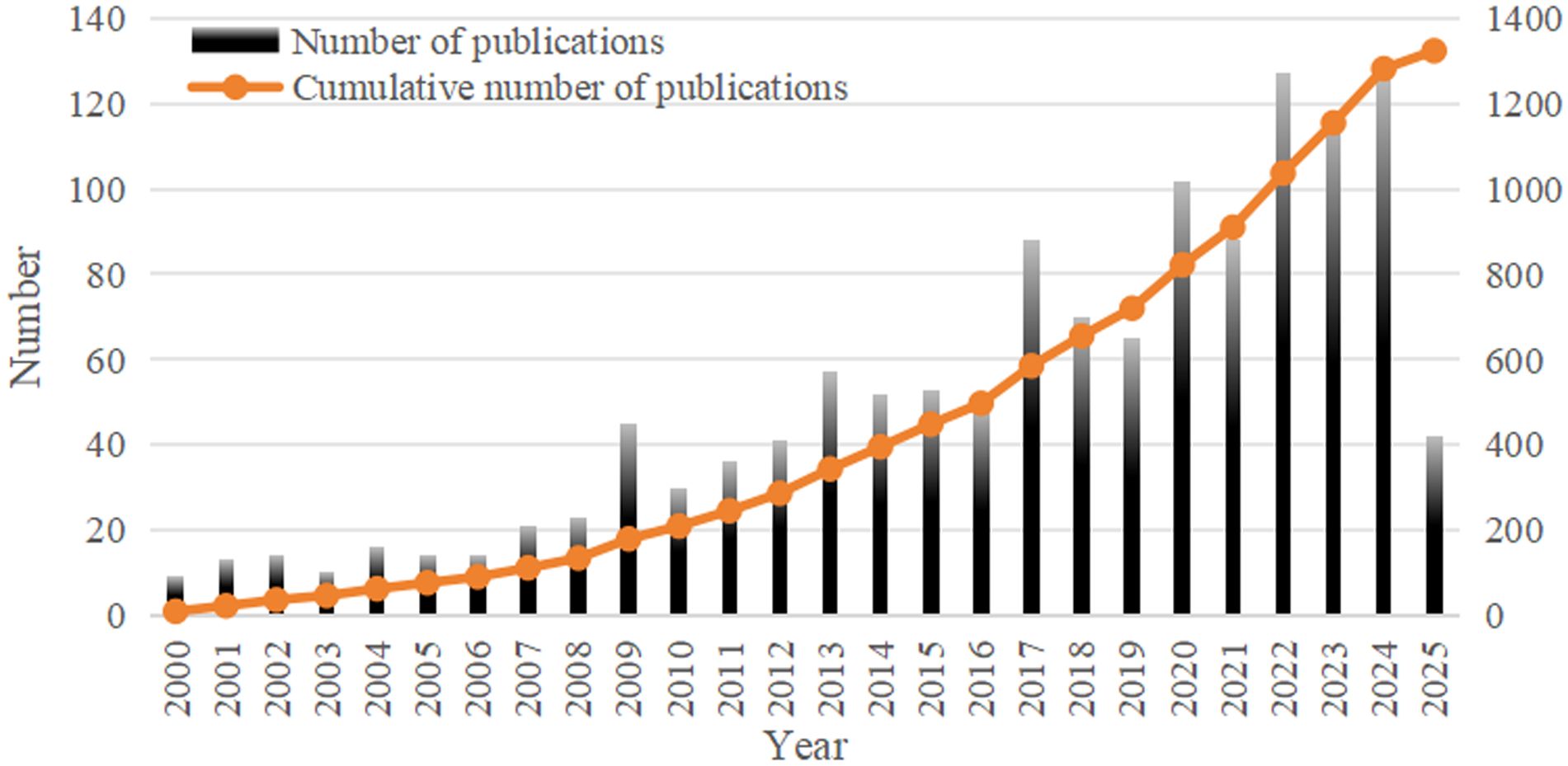 Bar and line graph showing the number of publications from 2000 to 2025. The number of publications, depicted in black bars, increases steadily. The cumulative number of publications, shown as an orange line, rises sharply, indicating an overall growth trend.