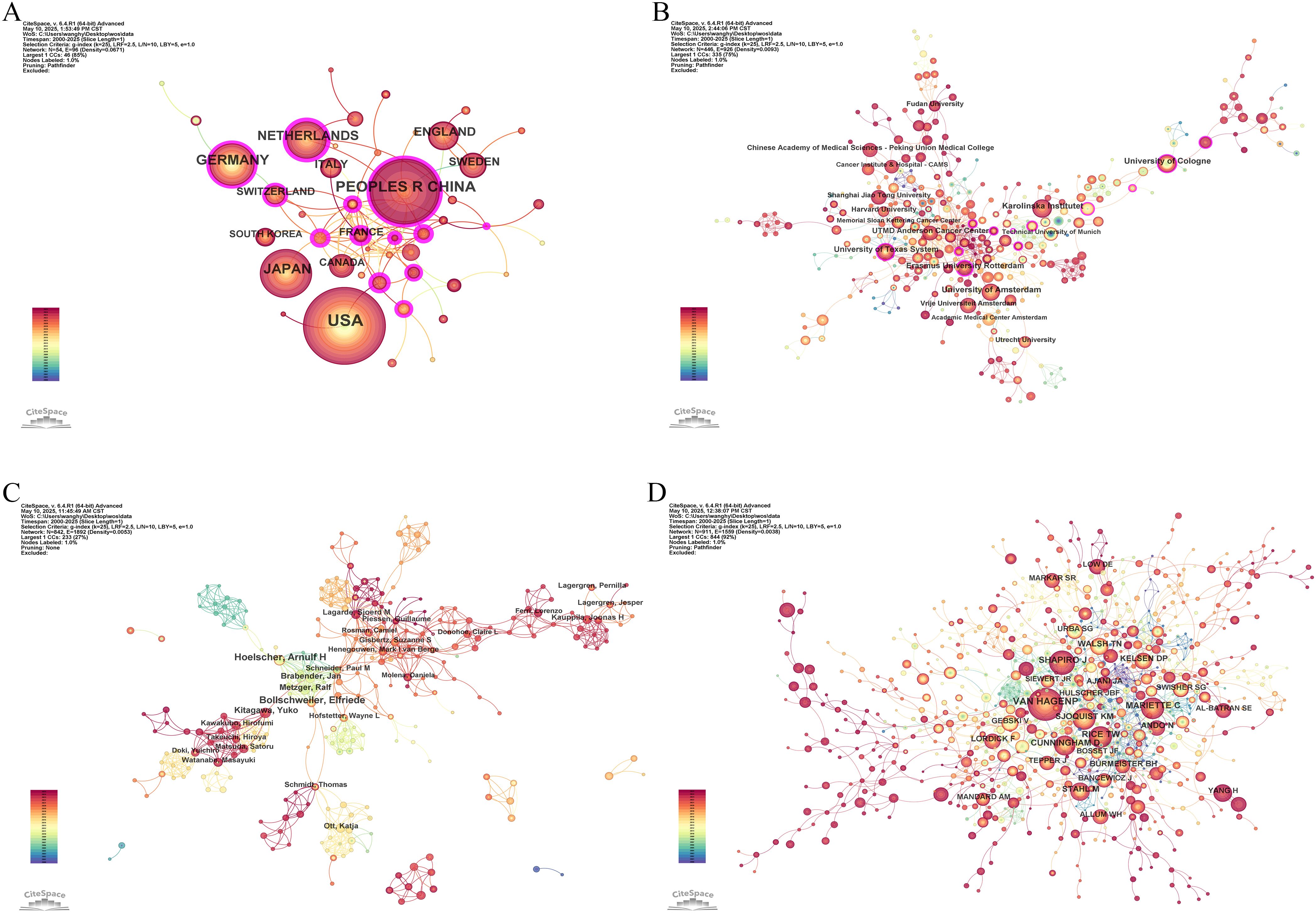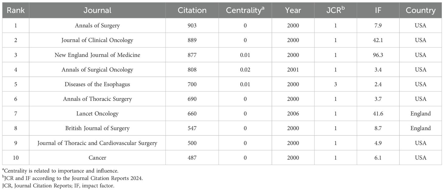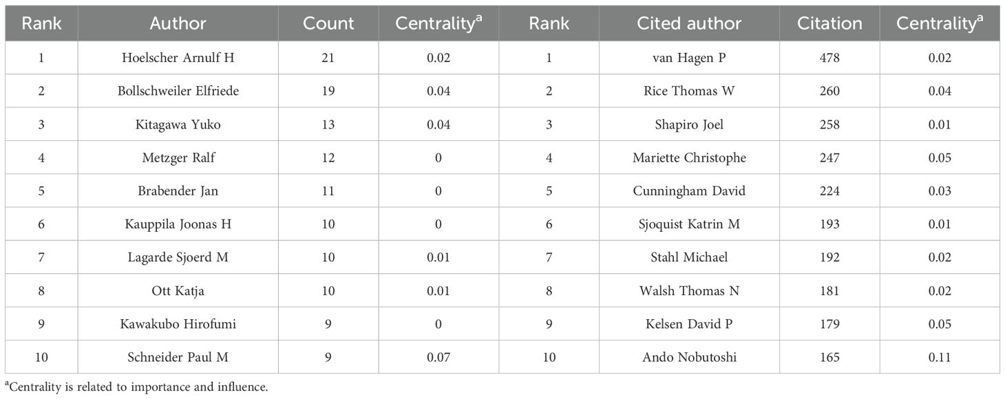 In the analysis of contributing authors, Hoelscher Arnulf H. and Bollschweiler Elfriede were identified as particularly prolific, having published 21 and 19 articles, respectively. In terms of citation frequency, Van Hagen P. was the most cited author, with 478 citations (Table 4). Although Ajani JA. was not among the top 10 most cited authors, he exhibited the highest centrality score (0.14), indicating significant influence within the citation network. Visualizations of co-authorship and co-citation networks are presented in Figures 4C, D.