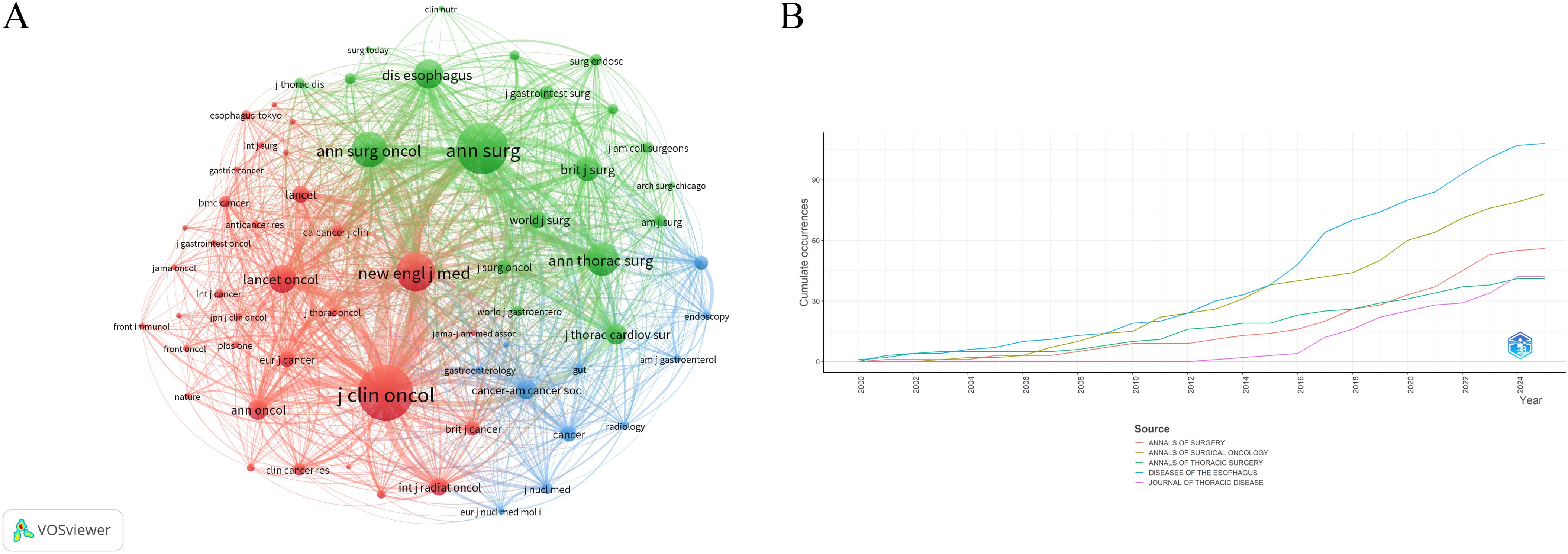A total of 749 journals were cited in the included literature. The five most frequently cited journals were: Annals of Surgery (903 citations), Journal of Clinical Oncology (889), New England Journal of Medicine (877), Annals of Surgical Oncology (808), and Diseases of The Esophagus (700). Notably, all of these journals are based in the United States, underscoring the country’s academic prominence in this research field (Table 5). A co-citation network visualization of the journals is shown in Figure 5A. Moreover, the number of published documents regarding neoadjuvant therapy for esophageal cancer has increased steadily over the past 25 years, with a marked acceleration after 2016. This trend likely reflects growing interest and advancements in neoadjuvant strategies followed by surgical intervention (Figure 5B).