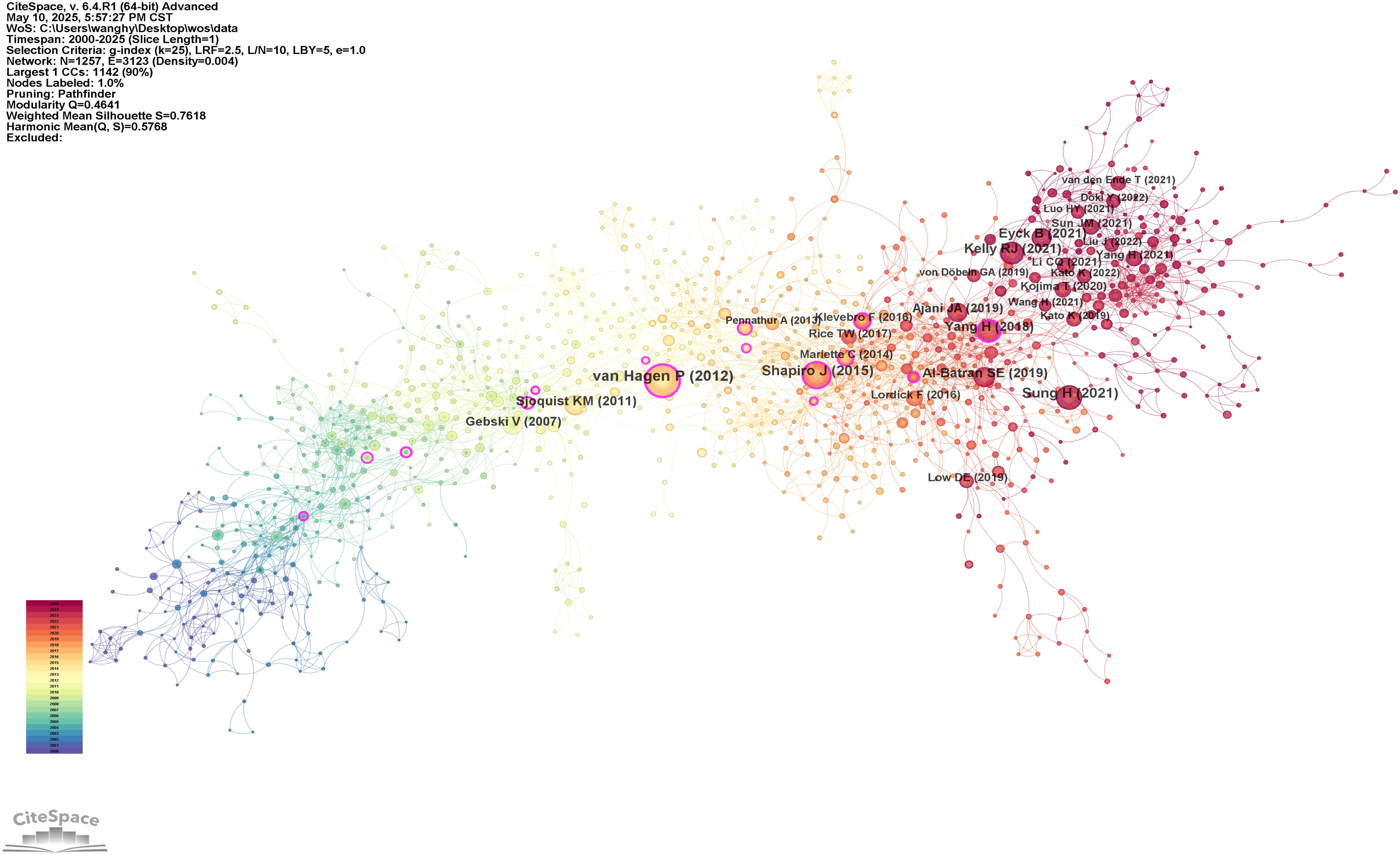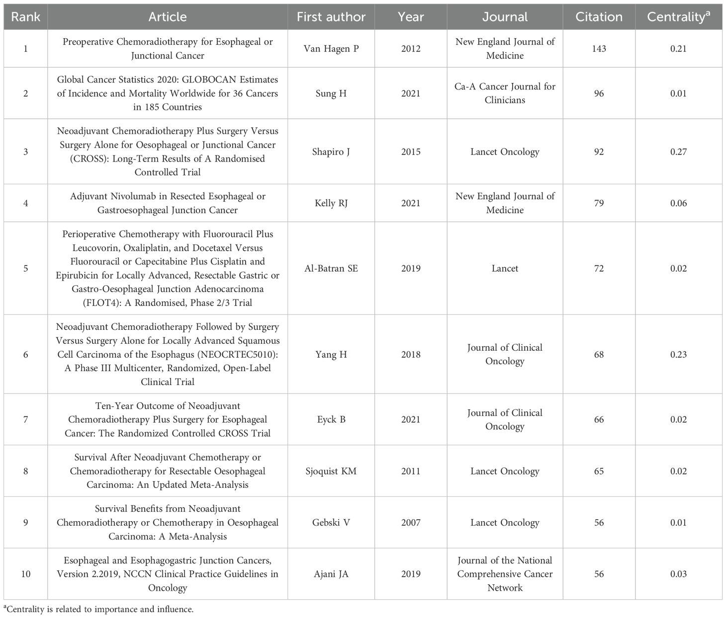 Table 6 and Figure 6 present the reference analysis. The CROSS study (5), a phase III RCT of NCRT for esophageal cancer, was the most frequently cited study, with 143 citations. This landmark study demonstrated that preoperative chemoradiotherapy significantly improves OS among patients with locally advanced esophageal cancer, providing foundational evidence that has shaped current treatment strategies. The remaining top five most cited references were authored by Sung et al. (1), Shapiro et al. (9), Kelly et al. (33), and Al-Batran et al. (6). Most of these highly cited works focus on NCRT in esophageal cancer treatment. However, it is noteworthy that the CheckMate 577 trial, reported by Kelly et al. and the CheckMate 577 Investigators (33), evaluated adjuvant nivolumab in resected esophageal cancer. Its high citation count suggests that immunotherapy is emerging as a significant research focus in this field.
