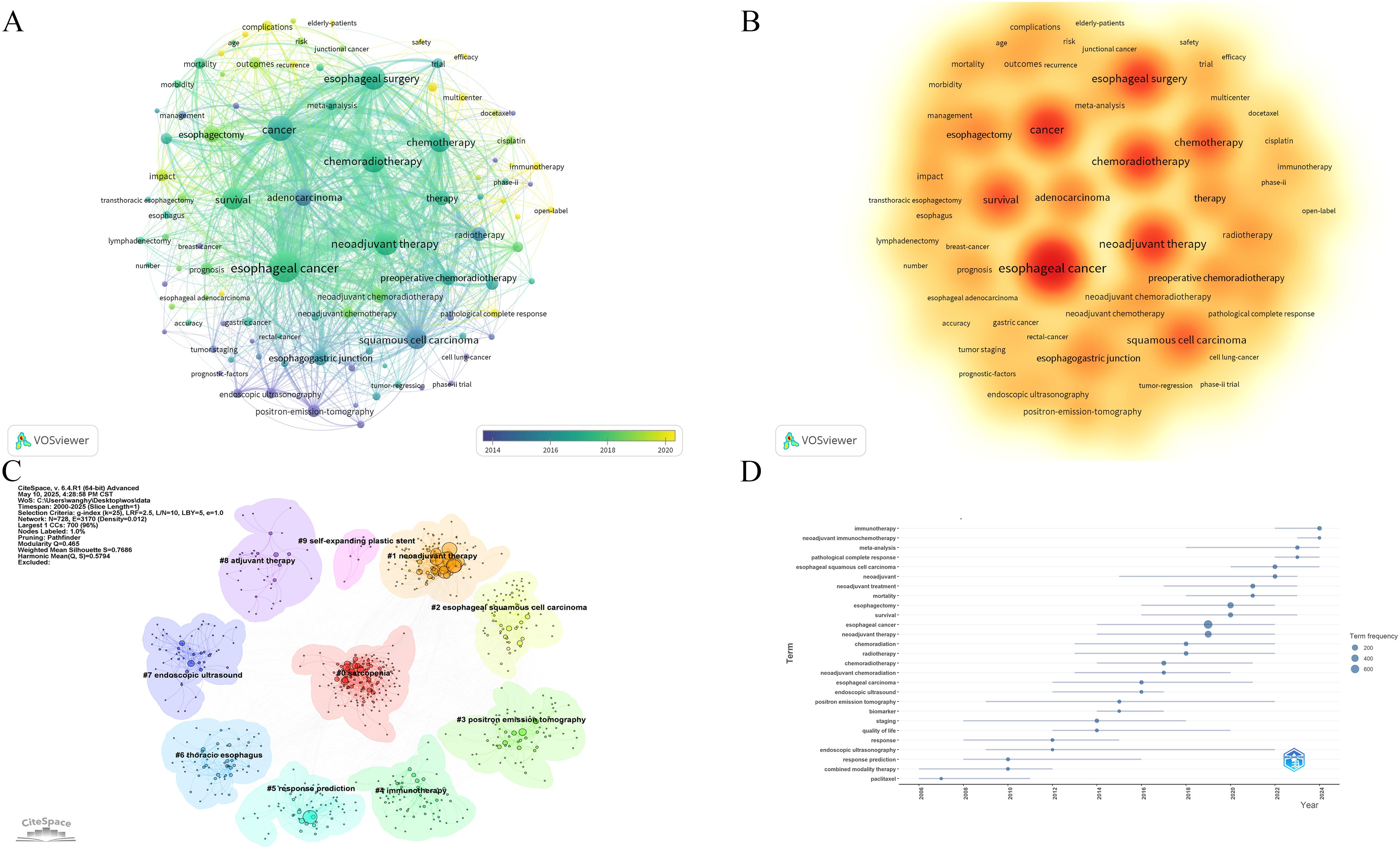 A collage of four scientific visualizations related to esophageal cancer research. Panel A displays a network map with terms like “esophageal surgery” and “chemoradiotherapy,” showing connections over time using color gradients from 2014 to 2020. Panel B is a heat map with similar terms, indicating frequency and relevance through color intensity. Panel C features a cluster map with various research themes labeled numerically, including “adjuvant therapy” and “self-expanding plastic stent.” Panel D presents a timeline graph showing term frequency from 2000 to 2020, with bubble sizes reflecting the prominence of each term.