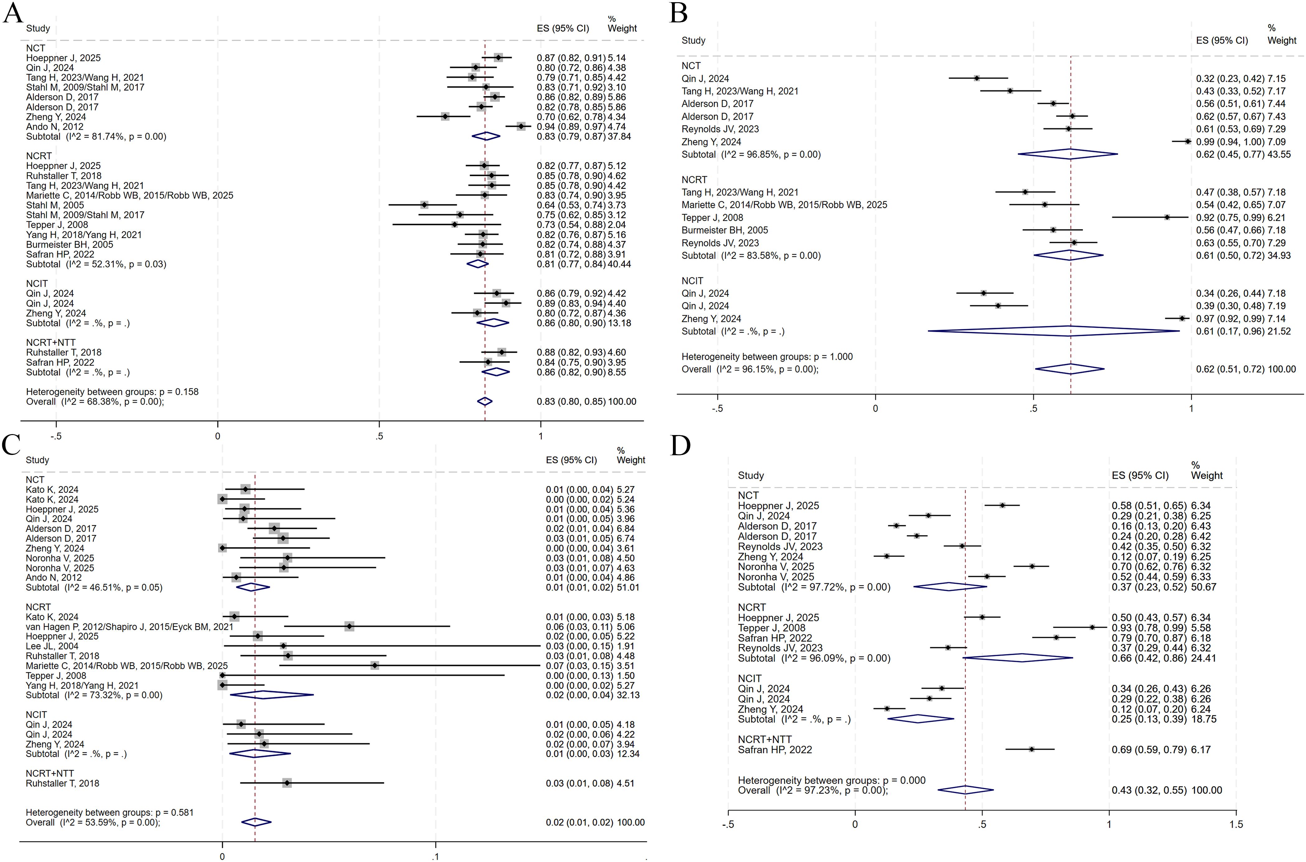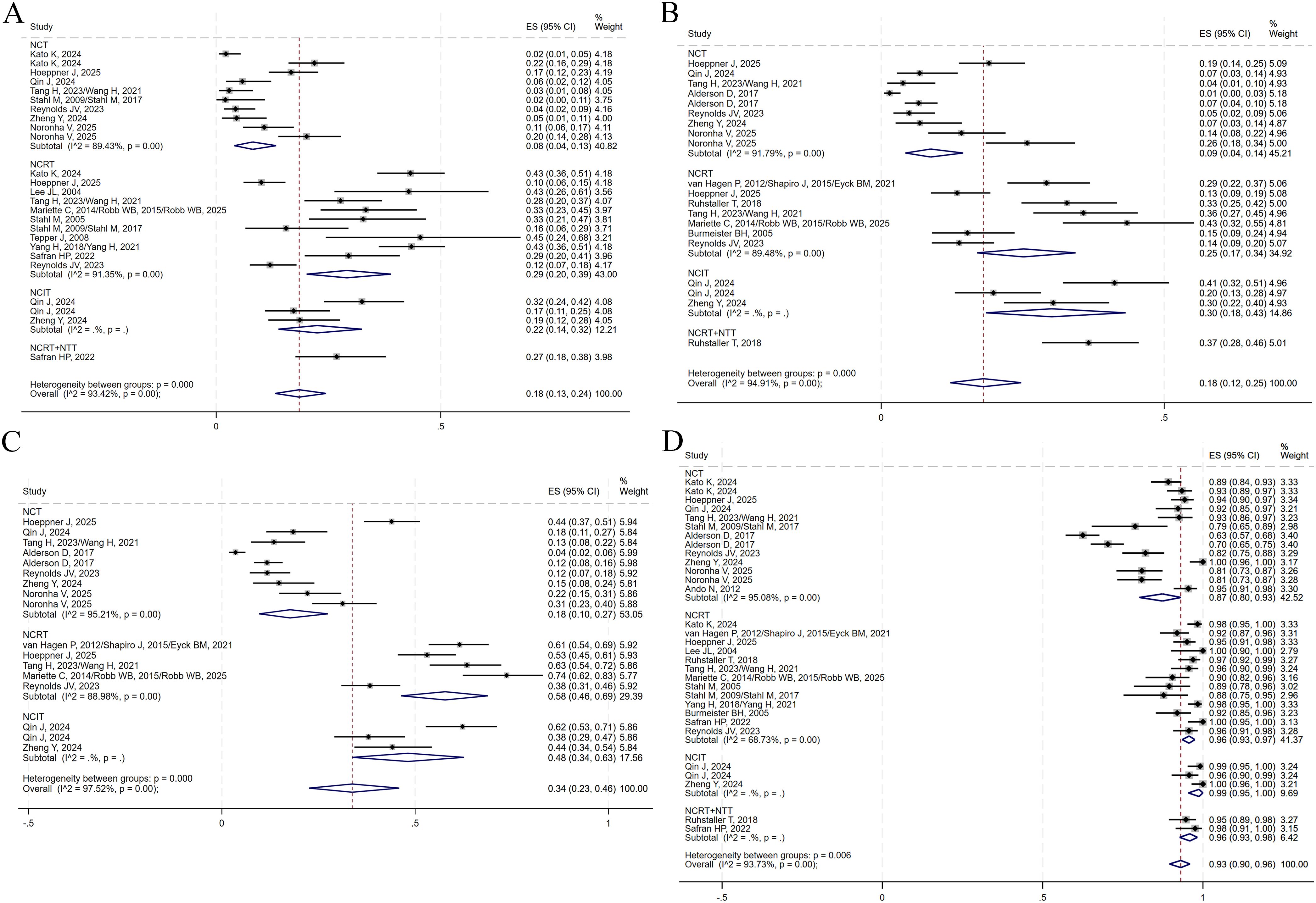 The presence of no residual live malignant cells in the primary tumor and the lymph nodes is defined as pCR. (i.e., ypT0N0cM0). A total of 14 studies reported pCR data. TRG was assessed using the Mandard scoring system, where TRG1 indicates no residual tumor cells and TRG2 indicates minimal residual tumor. TRG1 and combined TRG1 + 2 were reported in 11 and 9 studies, respectively. Notably, no studies in the NCRT+NTT group reported TRG1 + 2. The R0 resection rate, an important surgical outcome indicating complete tumor removal with negative margins, was reported in 18 studies. A random-effects model was applied to all analyses to account for substantial heterogeneity among studies. The pooled ES for pCR in the NCT, NCRT, NCIT, and NCRT+NTT groups were 0.08 (95% CI: 0.04–0.13; I²=89.43%), 0.29 (95% CI: 0.20–0.39; I²=91.35%), 0.22 (95% CI: 0.14–0.32), and 0.27 (95% CI: 0.18–0.38), respectively (Figure 8A). For TRG1, the ES values were 0.09 (95% CI: 0.04–0.14; I² = 91.79%) for NCT, 0.25 (95% CI: 0.17–0.34; I² = 89.48%) for NCRT, 0.30 (95% CI: 0.18–0.43) for NCIT, and 0.37 (95% CI: 0.28–0.46) for NCRT+NTT (Figure 8B). For TRG1 + 2, the ES was 0.18 (95% CI: 0.10–0.27; I²=95.21%) for NCT, 0.58 (95% CI: 0.46–0.69; I²=88.98%) for NCRT, and 0.48 (95% CI: 0.34–0.63) for NCIT (Figure 8C). The ES for R0 resection was 0.87 (95% CI: 0.80–0.93; I²=95.08%) for NCT, 0.96 (95% CI: 0.93–0.97; I²=68.73%) for NCRT, 0.99 (95% CI: 0.95–1.00) for NCIT, and 0.96 (95% CI: 0.93–0.98) for NCRT+NTT (Figure 8D).