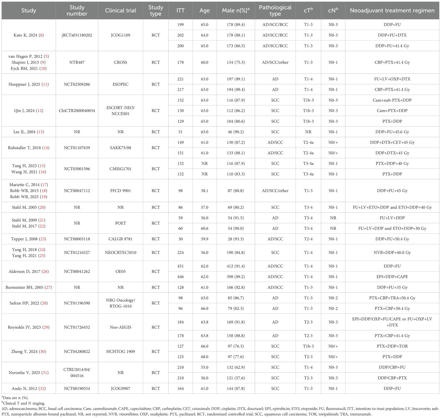 AD, adenocarcinoma; BCC, basal cell carcinoma; Cam, camrelizumab; CAPE, capecitabine; CBP, carboplatin; CET, cetuximab; DDP, cisplatin; DTX, docetaxel; EAD, esophageal adenocarcinoma; EPI, epirubicin; ESCC, esophageal squamous cell carcinoma; ETO, etoposide; FU, Fluorouracil; IF, impact factor; ITT, intention-to-treat population; JCR, Journal Citation Report; LV, leucovorin; nab-PTX, nanoparticle albumin-bound paclitaxel; MPR, major pathologic response; NA, not applicable; NCT, neoadjuvant chemotherapy; NCIT, neoadjuvant chemoimmunotherapy; NCRT, neoadjuvant chemoradiotherapy; NIT, neoadjuvant immunotherapy; NR, not reported; NTT, neoadjuvant targeted therapy; NVB, vinorelbine; OXP, oxaliplatin; pCR, complete pathologic response; PTX, paclitaxel; RCT, randomized controlled trial; SCC, squamous cell carcinoma; TOR, toripalimab; TRA, trastuzumab; TRAEs, treatment-related adverse events; TRG, tumor regression grade.