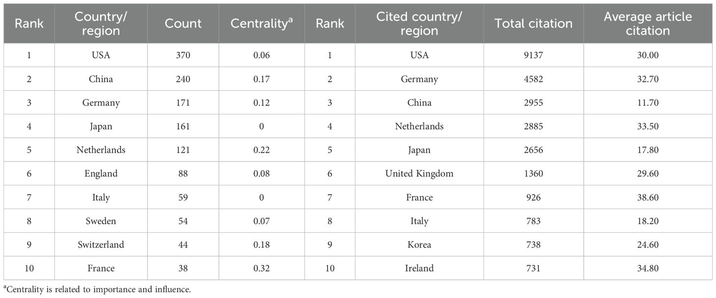 Table 2. The top ten countries/regions in terms of publication volume and citations.