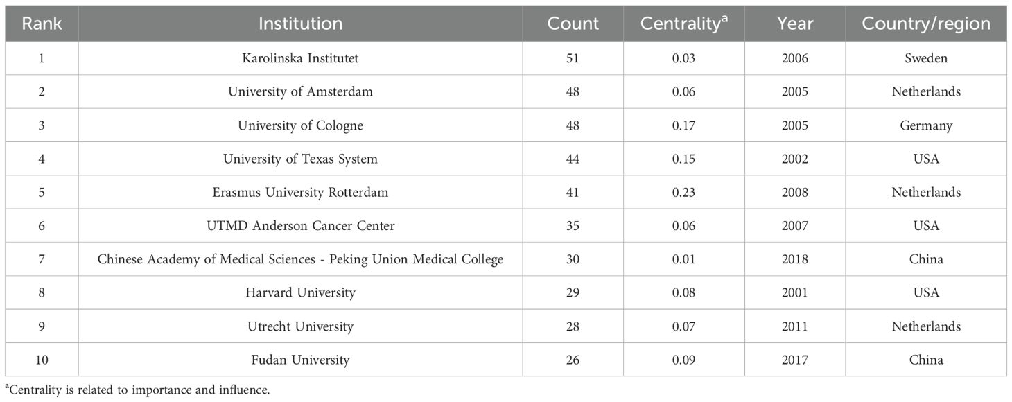 A total of 446 institutions contributed to the relevant literature. The top five institutions by number of publications were: Karolinska Institutet (51 publications, 3.85%), University of Amsterdam (48, 3.63%), University of Cologne (48, 3.63%), University of Texas System (44, 3.32%), and Erasmus University Rotterdam (41, 3.10%). Among the top 10 institutions, Erasmus University Rotterdam, University of Cologne, and University of Texas System exhibited the highest centrality scores, indicating their prominent roles in the collaborative research network (Table 3). Institutional collaboration and co-occurrence patterns are visualized in Figure 4B.