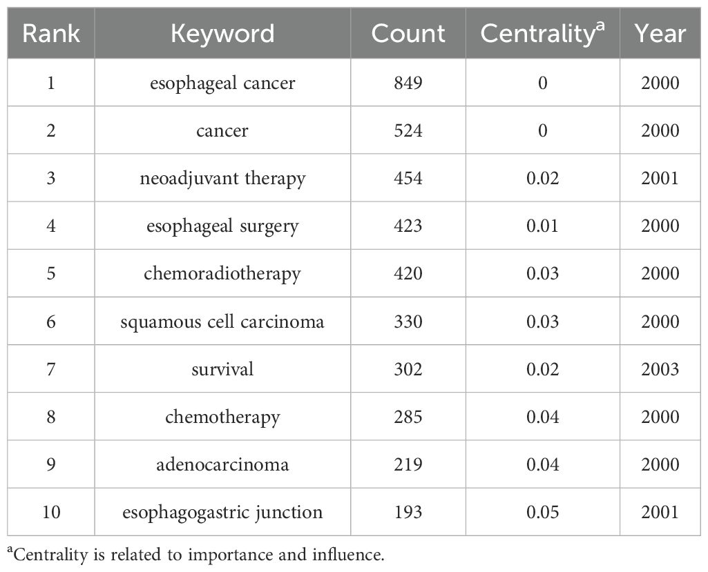 The analysis of keywords provides insight into research hotspots, evolving trends, and future directions within the field. In our study, the identified keywords were primarily associated with neoadjuvant treatment regimens, tumor histological types, tumor location, and follow-up outcomes. In 2009, Bollschweiler Elfriede reported notable discrepancies in the response to NCRT between ESCC and EAD (46). Consistently, the CROSS trial demonstrated a marked survival benefit for ESCC, reporting a median OS of 81.6 months (95% CI: 47.2–116.0) in the preoperative chemoradiotherapy group, compared to 43.2 months (95% CI: 24.9–61.4) for EAD (9)—nearly a twofold difference in median OS between the two histological subtypes. Additionally, the FLOT4 trial, which focused on gastroesophageal junction and gastric adenocarcinomas, demonstrated that fluorouracil, leucovorin, oxaliplatin, and docetaxel (FLOT) regimen resulted in significantly better pathological remission rates than those of the ECX or ECF regimens, which include epirubicin, cisplatin, and capecitabine or fluorouracil. Recent studies such as ESOPEC and Neo-AEGIS have further compared the CROSS regimen to preoperative chemotherapy alone in patients with EAD, aiming to refine treatment strategies based on histological and anatomical differences. In the Neo-AEGIS study, the 3-year OS rates were 55% (95% CI: 47–62) in the NCT group and 57% (95% CI: 49–64) in the CROSS group, with no statistically difference observed (HR: 1.03; 95% CI: 0.77–1.38; P = 0.82). Similarly, no statistically difference was found in median DFS (HR: 0.89; 95% CI: 0.68–1.17; P = 0.41). However, the CROSS regimen demonstrated significantly higher rates of pCR, MPR, and R0 resection than those of chemotherapy alone (29). In contrast, the ESOPEC trial, which employed the FLOT regimen for NCT, reported a significantly higher 3-year OS of 57.4% (95% CI: 50.1–64.0) compared to 50.7% (95% CI: 43.5–57.5) in the CROSS group (HR: 0.70; 95% CI: 0.53–0.92; P = 0.01) (11). The differing outcomes of these two trials may be attributed to variations in the chemotherapy regimens utilized. These findings underscore the importance of tailoring neoadjuvant treatment strategies for esophageal cancer based on histological subtypes, highlighting the need for personalized, pathology-specific approaches to optimize clinical outcomes.