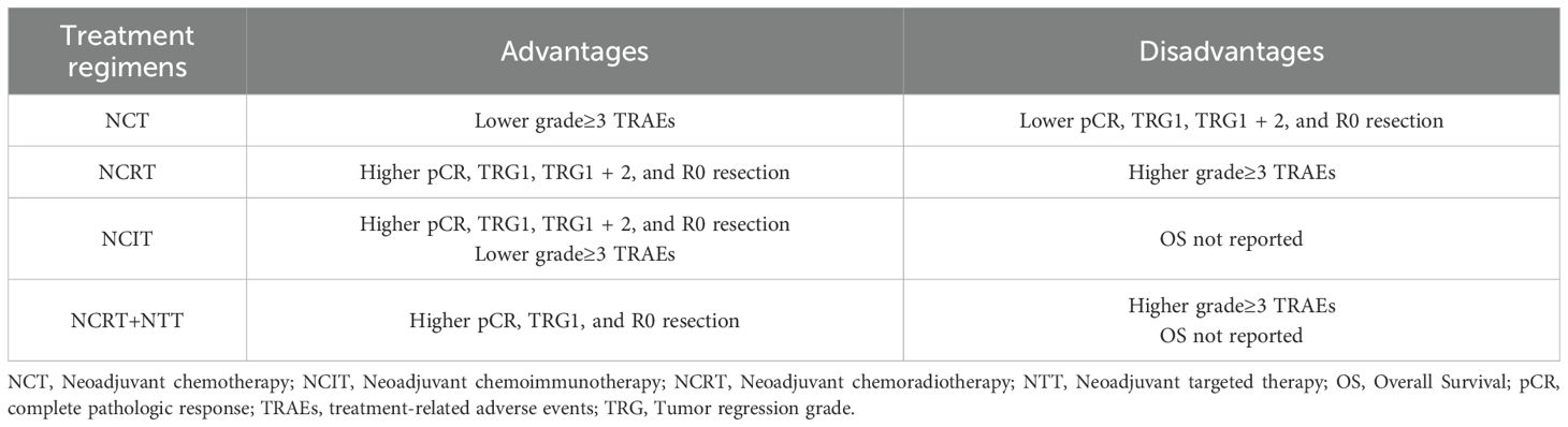 In conclusion, neoadjuvant therapy for esophageal cancer has significantly developed over the past 25 years. The efficacy and safety of NCRT and NCT have been well established, supported by robust long-term follow-up data. In contrast, NIT has demonstrated promising efficacy in recent years; however, it currently lacks validation from long-term follow-up data from phase III RCTs. Notably, the effectiveness of neoadjuvant treatment regimens appears to vary depending on tumor histology and clinical stage. Therefore, further high-quality studies are warranted to refine patient stratification and determine the most appropriate individualized neoadjuvant treatment strategies.