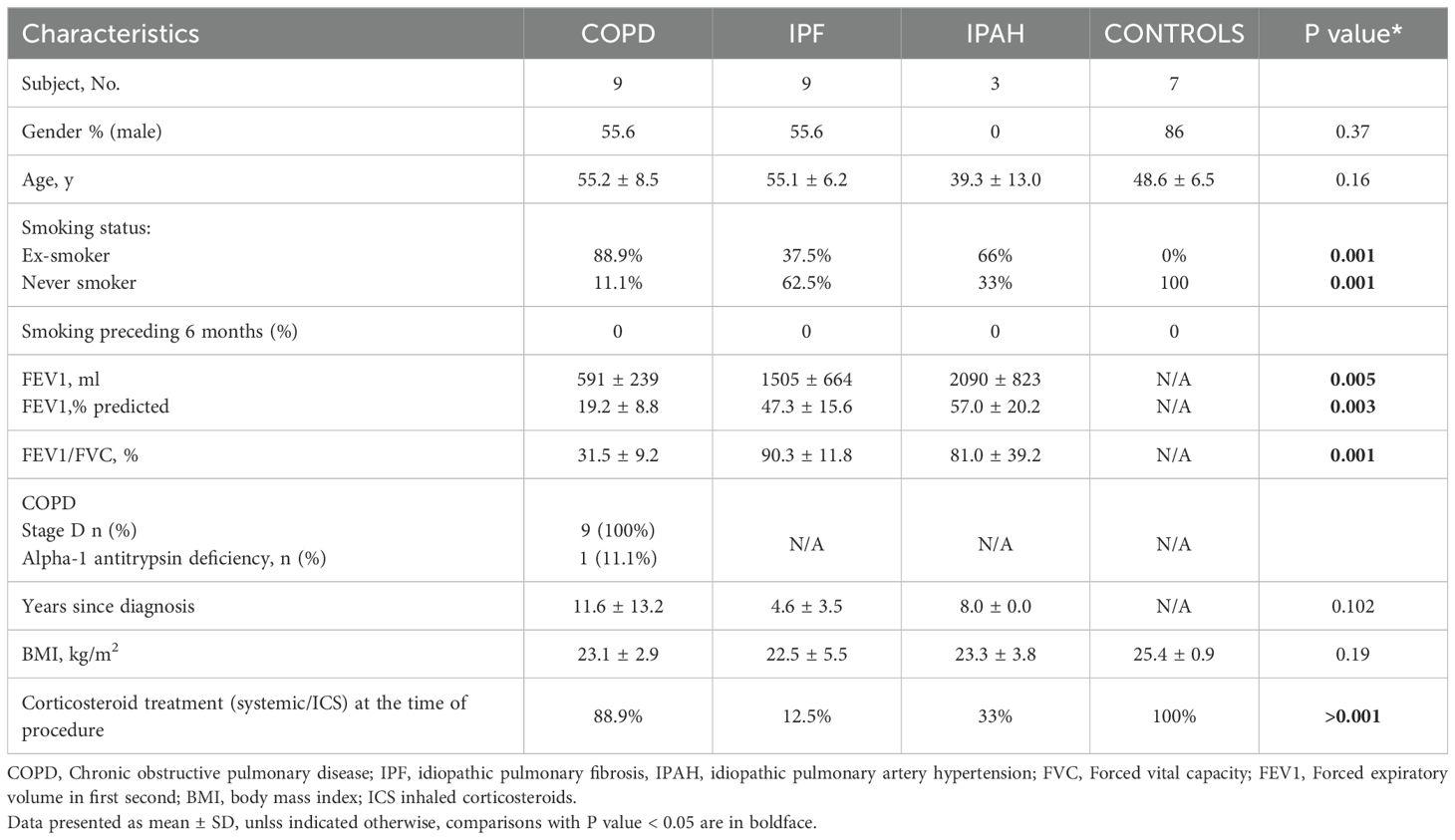 Explanted lung tissue samples from 9 patients with advanced COPD, 9 patients with advanced IPF, and 3 patients with IPAH were included in the analysis; for the control group, we included lung tissue samples from 7 lung donors (Table 1). COPD and IPF patients and donors did not differ significantly in age, with a mean age of 55 in both groups, compared with 48.6 (± 6.5) years in lung donors (p 0.16); patients with IPAH were younger (mean 39 years ± 13). Approximately half of the patients in the COPD and IPF groups were male; however, most lung donors (6 out of 7) were male, and all individuals with IPAH were female. The great majority of patients with COPD (8 of 9) and one-third of those with IPF (3 of 9) were ex-smokers; all lung donors and IPAH individuals were never smokers. Pulmonary function decline was more pronounced in COPD patients, with the majority (8 out of 9) receiving inhaled corticosteroid treatment at the time of inclusion (Table 1).